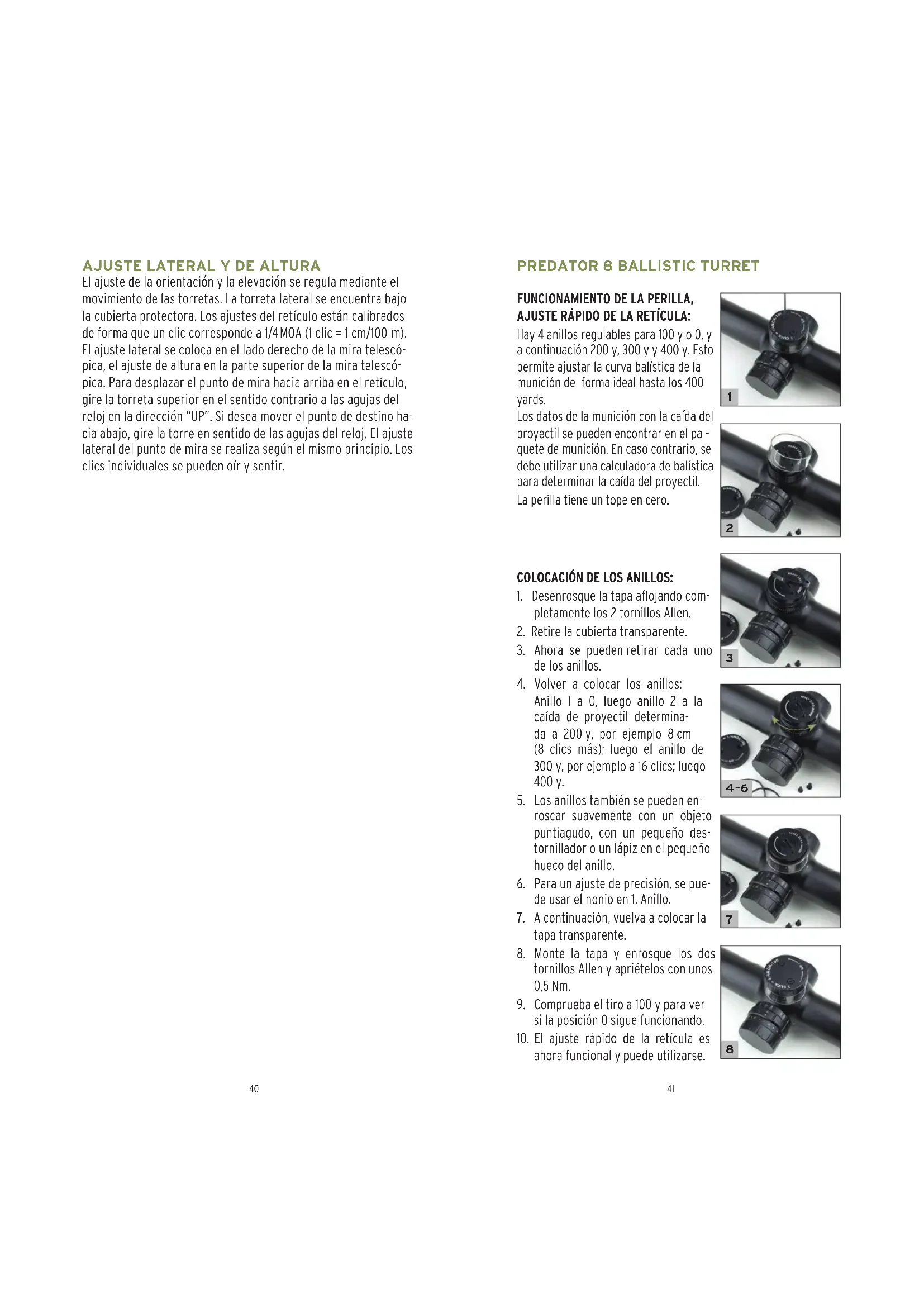 quete de munición. En caso contrario, se debe utilizar una calculadora de balística para determinar la caída del proyectil. La perilla tiene un tope en cero. COLOCACIÓN DE LOS ANILLOS: