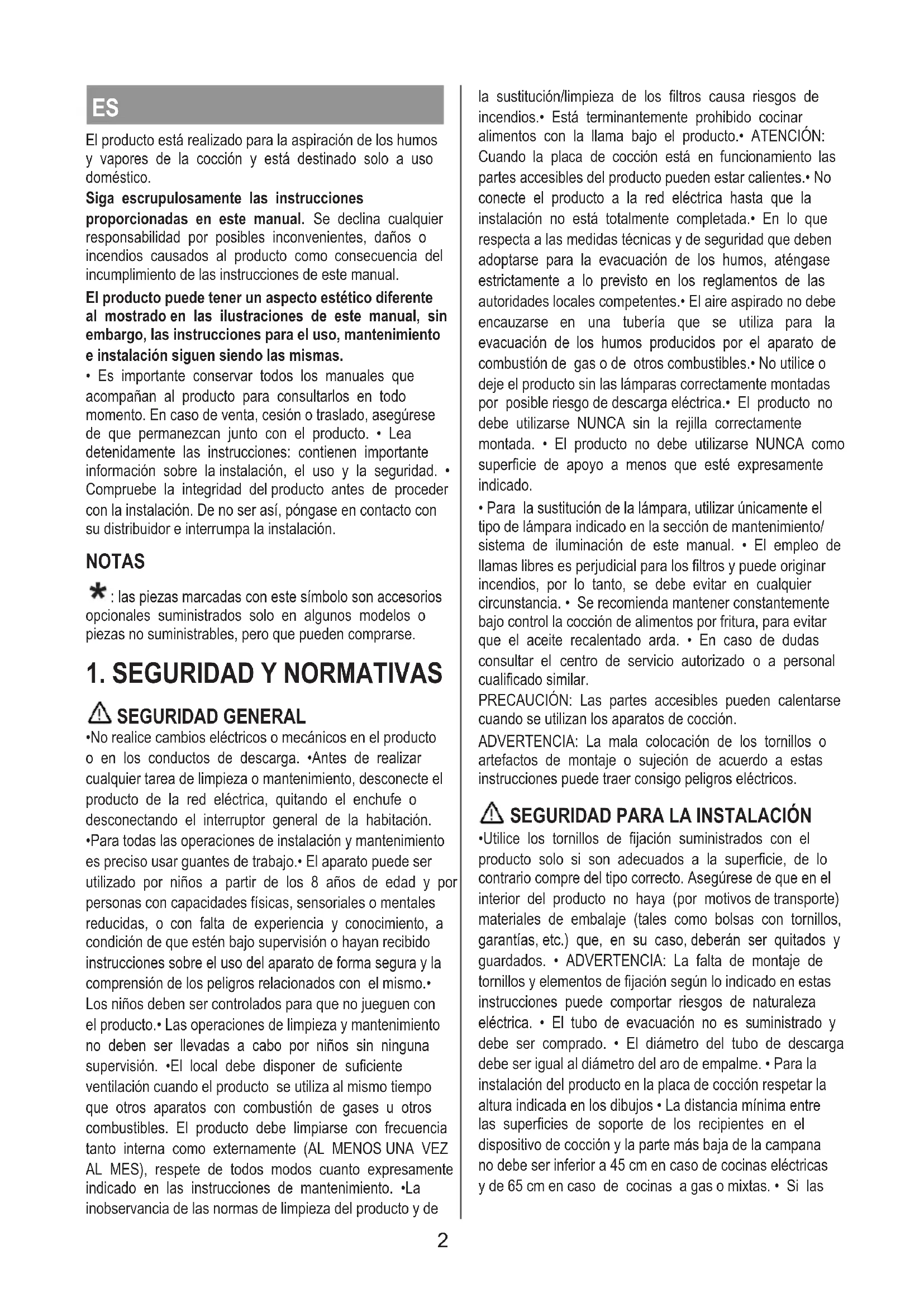- Para todas las operaciones de instalación y mantenimiento es preciso usar guantes de trabajo.• El aparato puede ser utilizado por niños a partir de los 8 años de edad y por personas con capacidades físicas, sensoriales o mentales reducidas, o con falta de experiencia y conocimiento, a condición de que estén bajo supervisión o hayan recibido instrucciones sobre el uso del aparato de forma segura y la comprensión de los peligros relacionados con el mismo.• Los niños deben ser controlados para que no jueguen con el producto.• Las operaciones de limpieza y mantenimiento no deben ser llevadas a cabo por niños sin ninguna supervisión. •El local debe disponer de suficiente ventilación cuando el producto se utiliza al mismo tiempo que otros aparatos con combustión de gases u otros combustibles. El producto debe limpiarse con frecuencia tanto interna como externamente (AL MENOS UNA VEZ AL MES), respete de todos modos cuanto expresamente indicado en las instrucciones de mantenimiento. •La inobservancia de las normas de limpieza del producto y de la sustitución/limpieza de los filtros causa riesgos de incendios.• Está terminantemente prohibido cocinar alimentos con la llama bajo el producto.• ATENCIÓN: Cuando la placa de cocción está en funcionamiento las partes accesibles del producto pueden estar calientes.• No conecte el producto a la red eléctrica hasta que la instalación no está totalmente completada.• En lo que respecta a las medidas técnicas y de seguridad que deben adoptarse para la evacuación de los humos, aténgase estrictamente a lo previsto en los reglamentos de las autoridades locales competentes.• El aire aspirado no debe encauzarse en una tubería que se utiliza para la evacuación de los humos producidos por el aparato de combustión de gas o de otros combustibles.• No utilice o deje el producto sin las lámparas correctamente montadas por posible riesgo de descarga eléctrica.• El producto no debe utilizarse NUNCA sin la rejilla correctamente montada. • El producto no debe utilizarse NUNCA como superficie de apoyo a menos que esté expresamente indicado.