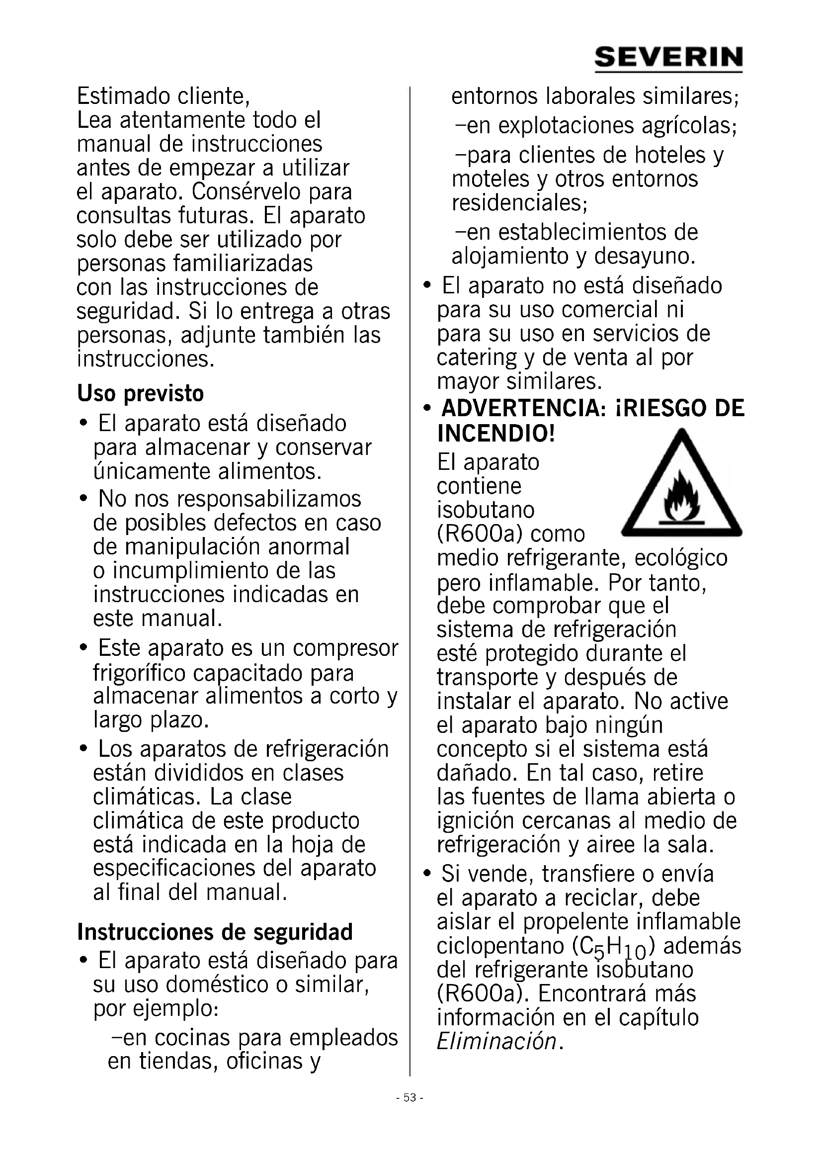 - ADVERTENCIA: ¡RIESGO DE INCENDIO! El aparato contiene isobutano (R600a) como medio refrigerante, ecológico pero inamable. Por tanto, debe comprobar que el sistema de refrigeración esté protegido durante el transporte y después de instalar el aparato. No active el aparato bajo ningún concepto si el sistema está dañado. En tal caso, retire las fuentes de llama abierta o ignición cercanas al medio de refrigeración y airee la sala.