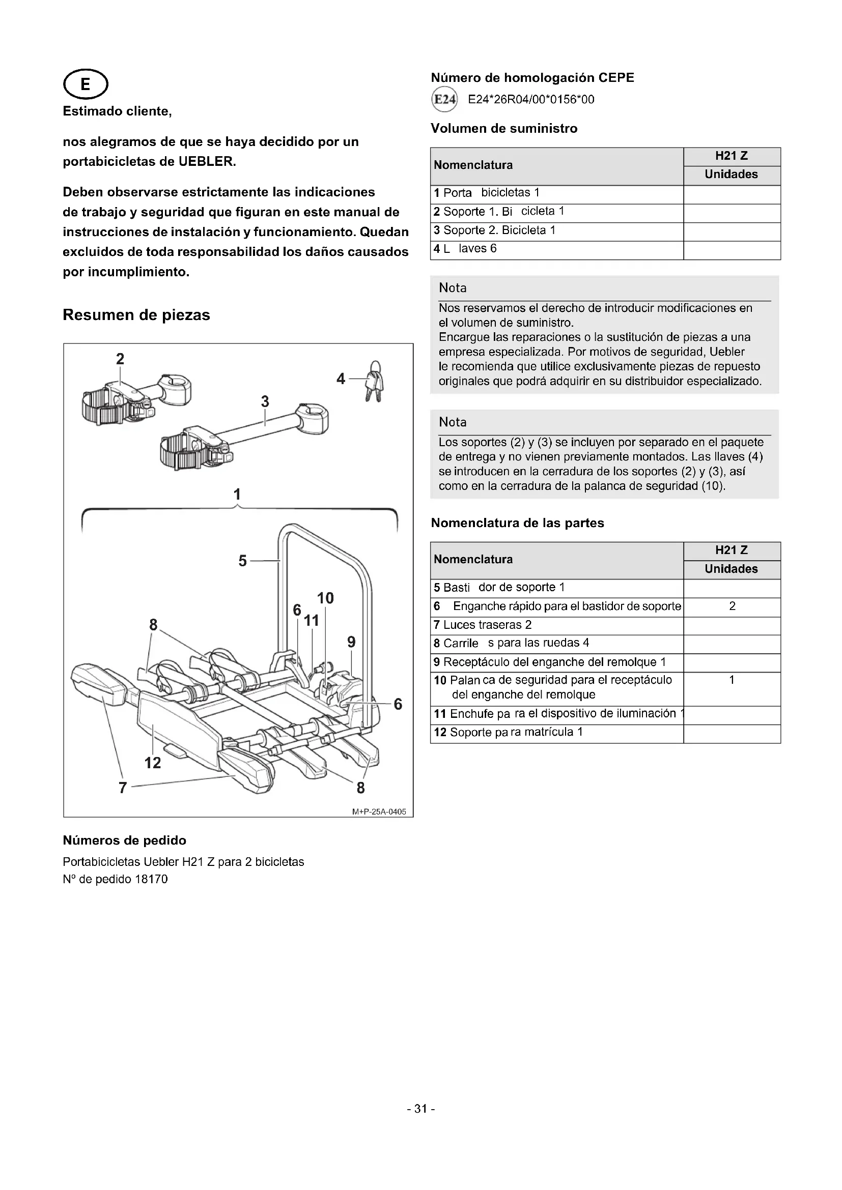 strucciones de instalación y funcionamiento. Quedan excluidos de toda responsabilidad los daños causados por incumplimiento. Resumen de piezas Números de pedido Portabicicletas Uebler H21 Z para 2 bicicletas Nº de pedido 18170 Número de homologación CEPE E24*26R04/00*0156*00 Volumen de suministro Nomenclatura de las partes