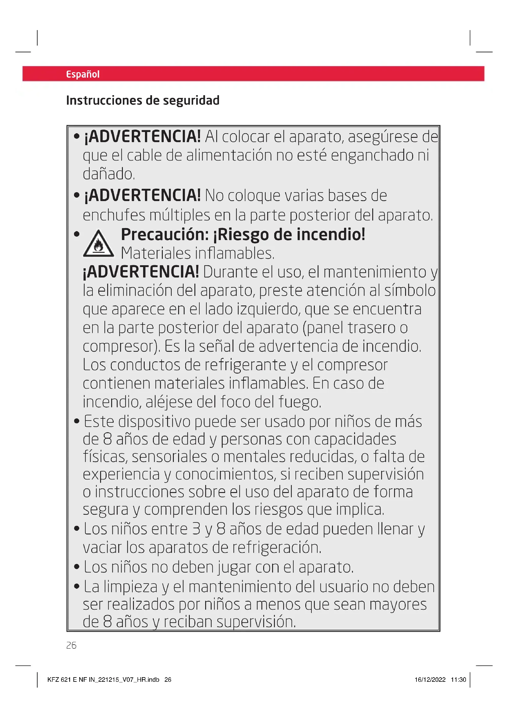- La limpieza y el mantenimiento del usuario no deben ser realizados por niños a menos que sean mayores de 8 años y reciban supervisión. KFZ 621 E NF IN_221215_V07_HR.indb 26KFZ 621 E NF IN_221215_V07_HR.indb 26 16/12/2022 11:3016/12/2022 11:30Español