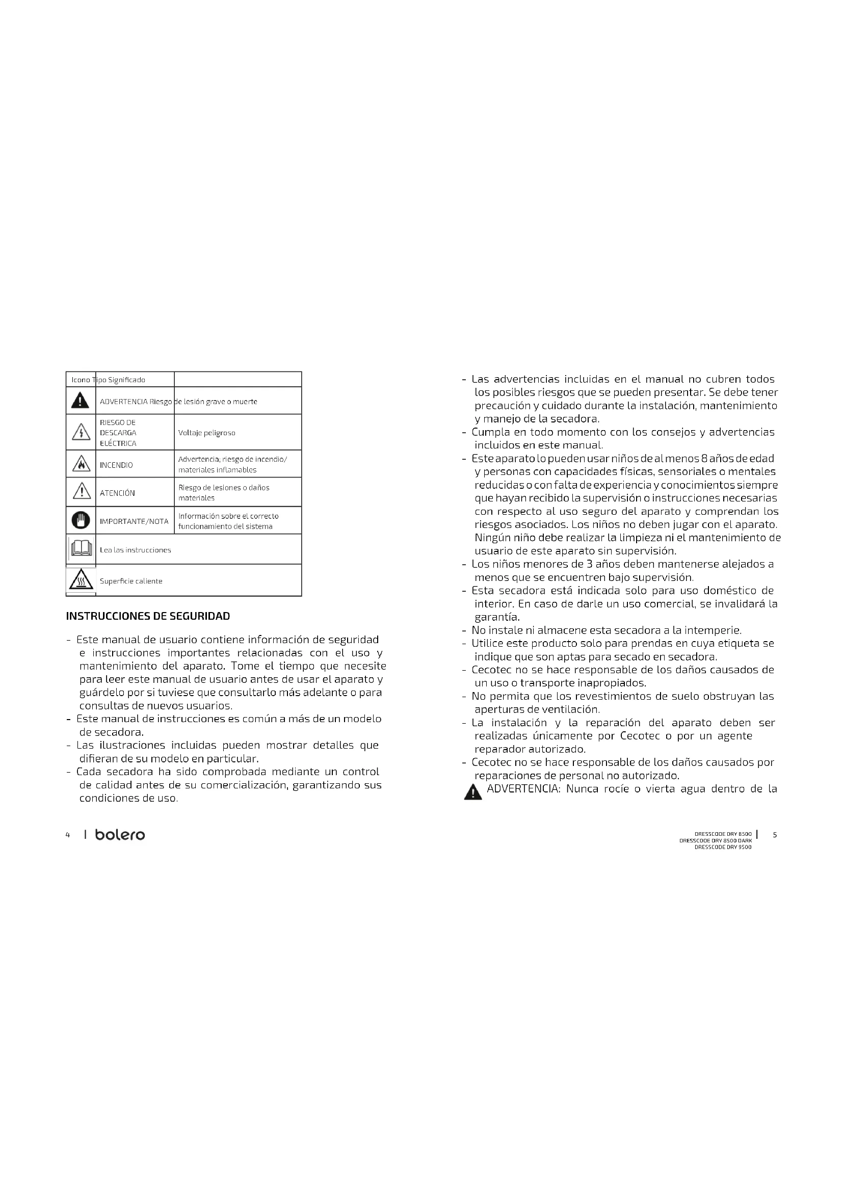 DRESSCODE DRY 9500 - Las advertencias incluidas en el manual no cubren todos los posibles riesgos que se pueden presentar. Se debe tener precaución y cuidado durante la instalación, mantenimiento y manejo de la secadora. - Cumpla en todo momento con los consejos y advertencias incluidos en este manual. - Este aparato lo pueden usar niños de al menos 8 años de edad y personas con capacidades físicas, sensoriales o mentales reducidas o con falta de experiencia y conocimientos siempre que hayan recibido la supervisión o instrucciones necesarias con respecto al uso seguro del aparato y comprendan los riesgos asociados. Los niños no deben jugar con el aparato. Ningún niño debe realizar la limpieza ni el mantenimiento de usuario de este aparato sin supervisión. - Los niños menores de 3 años deben mantenerse alejados a menos que se encuentren bajo supervisión. - Esta secadora está indicada solo para uso doméstico de interior. En caso de darle un uso comercial, se invalidará la garantía. - No instale ni almacene esta secadora a la intemperie. - Utilice este producto solo para prendas en cuya etiqueta se indique que son aptas para secado en secadora. - Cecotec no se hace responsable de los daños causados de un uso o transporte inapropiados. - No permita que los revestimientos de suelo obstruyan las aperturas de ventilación. - La instalación y la reparación del aparato deben ser realizadas únicamente por Cecotec o por un agente reparador autorizado. - Cecotec no se hace responsable de los daños causados por reparaciones de personal no autorizado. ADVERTENCIA: Nunca rocíe o vierta agua dentro de la Icono Tipo Signicado ADVERTENCIA Riesgo de lesión grave o muerte RIESGO DE DESCARGA ELÉCTRICA Voltaje peligroso INCENDIO Advertencia; riesgo de incendio/ materiales inamables ATENCIÓN Riesgo de lesiones o daños materiales IMPORTANTE/NOTA Información sobre el correcto funcionamiento del sistema Lea las instrucciones Supercie caliente