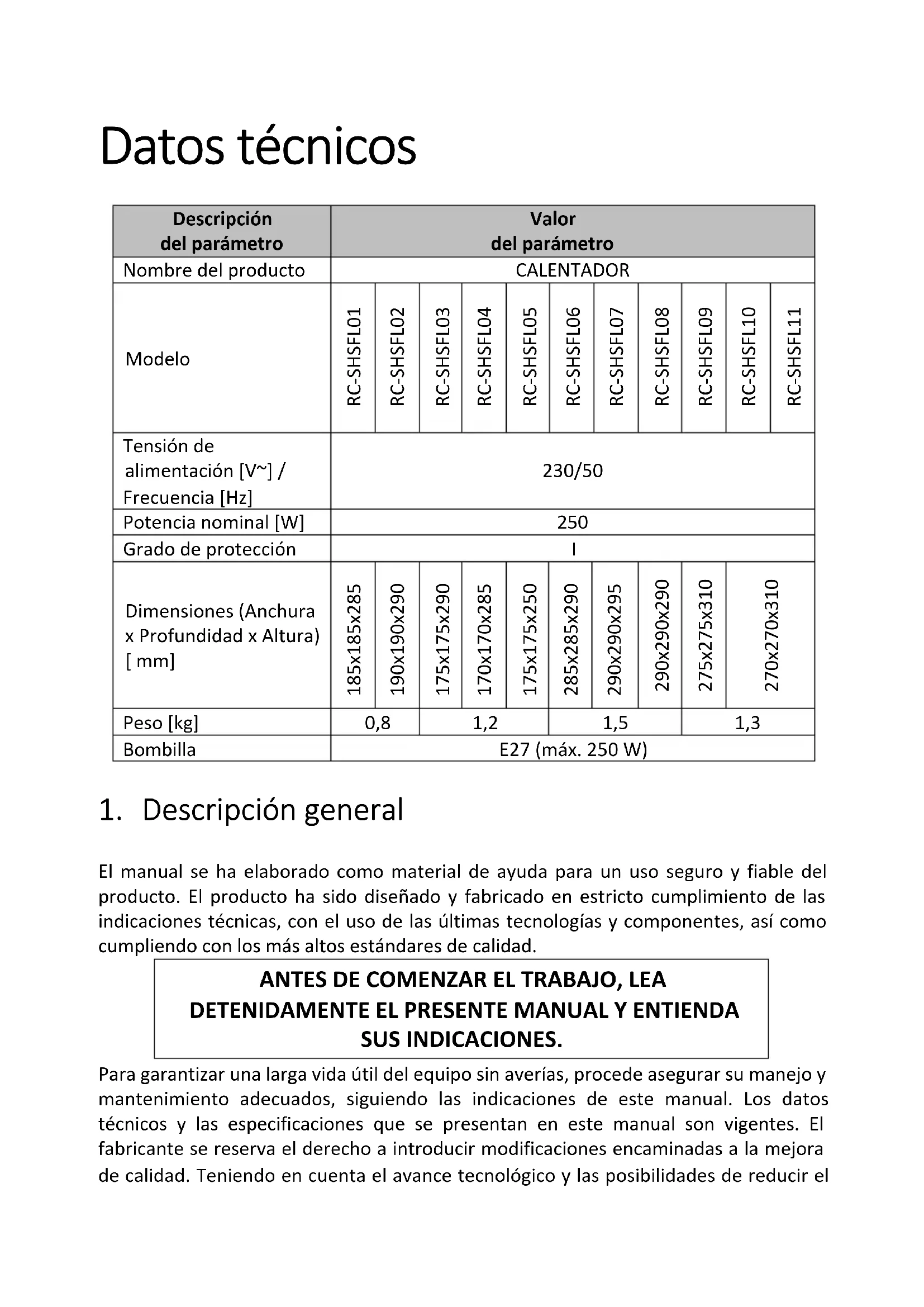 ¡ATENCIÓN! Lea todas las advertencias relativas a la seguridad y todas las instrucciones pertinentes. La inobservancia de las advertencias y las instrucciones puede resultar en un choque eléctrico, lesiones corporales graves o la muerte. El término "equipo" o "producto" utilizado en las advertencias y la descripción del manual hace referencia a: CALENTADOR. 2.1. Seguridad eléctrica a) No tocar el equipo con las manos mojadas. b) No utilizar el cable de una manera distinta del uso previsto. Nunca se debe utilizar para transportar el equipo o retirar el enchufe de la toma eléctrica. Mantener el cable lejos de las fuentes de calor, aceites, superficies puntiagudas o piezas móviles. Los cables dañados o enredados incrementan el riesgo de choque eléctrico. c) Está prohibido utilizar el equipo si el cable de alimentación presenta daños o indicios de desgaste. Un cable de alimentación dañado se debe entregar a un electricista cualificado o el servicio técnico del fabricante para su sustitución. d) ¡ATENCIÓN: PELIGRO PARA LA VIDA! Nunca sumergir el equipo en el agua ni otros líquidos durante su limpieza o utilización. e) ¡No utilizar el equipo en espacios expuestos a una humedad muy elevada ni junto a depósitos llenos de agua! f) No permitir que el equipo se moje. ¡Riesgo de choque eléctrico! 2.2. Seguridad en el trabajo a) No utilizar el equipo en áreas con riesgo de explosión, por ejemplo en presencia de líquidos, gases o polvos inflamables. El equipo genera chispas inflamables en contacto con el polvo o el vapor. b) En caso de observar daños o un trabajo incorrecto del equipo, se debe apagar inmediatamente y comunicar la irregularidad al responsable. c) Solo el servicio técnico del fabricante se puede encargar de la reparación del equipo. ¡No reparar el equipo por cuenta propia! d) En caso de aparición de chispas o fuego, utilizar solamente extintores de polvo químico y CO2. e) Está prohibida la presencia de niños o terceros en la estación de trabajo. (El descuido puede resultar en la pérdida de control sobre el equipo.) f) El equipo se debe utilizar en espacios con buena ventilación.g) Guardar el manual de uso para futuras consultas. Si el equipo se va a entregar a terceros, adjuntar el manual de uso. h) Los elementos del embalaje y pequeños elementos de montaje se deben guardar fuera del alcance de los niños.