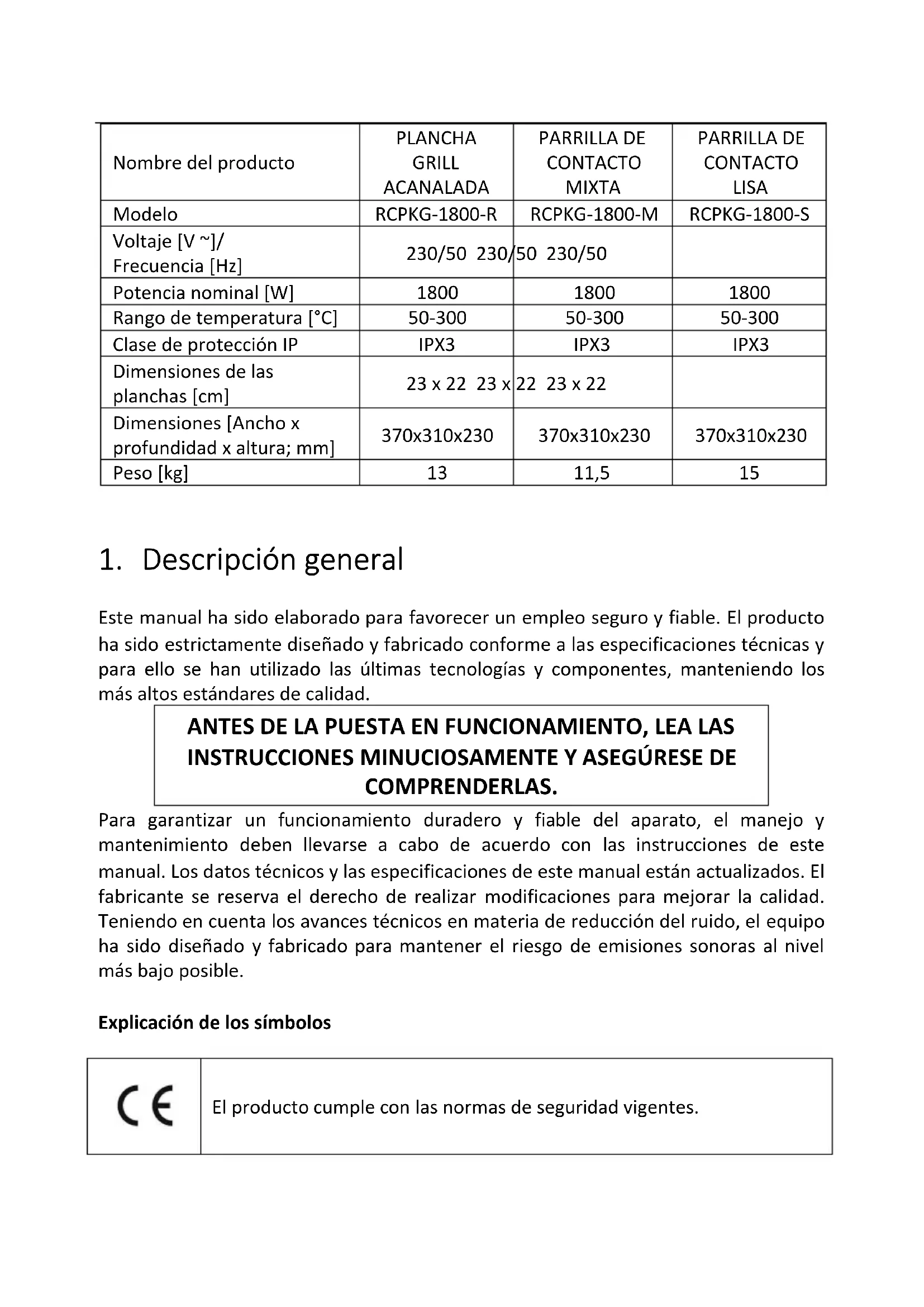 Parámetro - Descripción Parámetro - ValorNombre del producto PLANCHA GRILL ACANALADA PARRILLA DE CONTACTO MIXTA PARRILLA DE CONTACTO LISA Modelo RCPKG-1800-R RCPKG-1800-M RCPKG-1800-S Voltaje [V ~]/ Frecuencia [Hz] 230/50 230/50 230/50 Potencia nominal [W]
