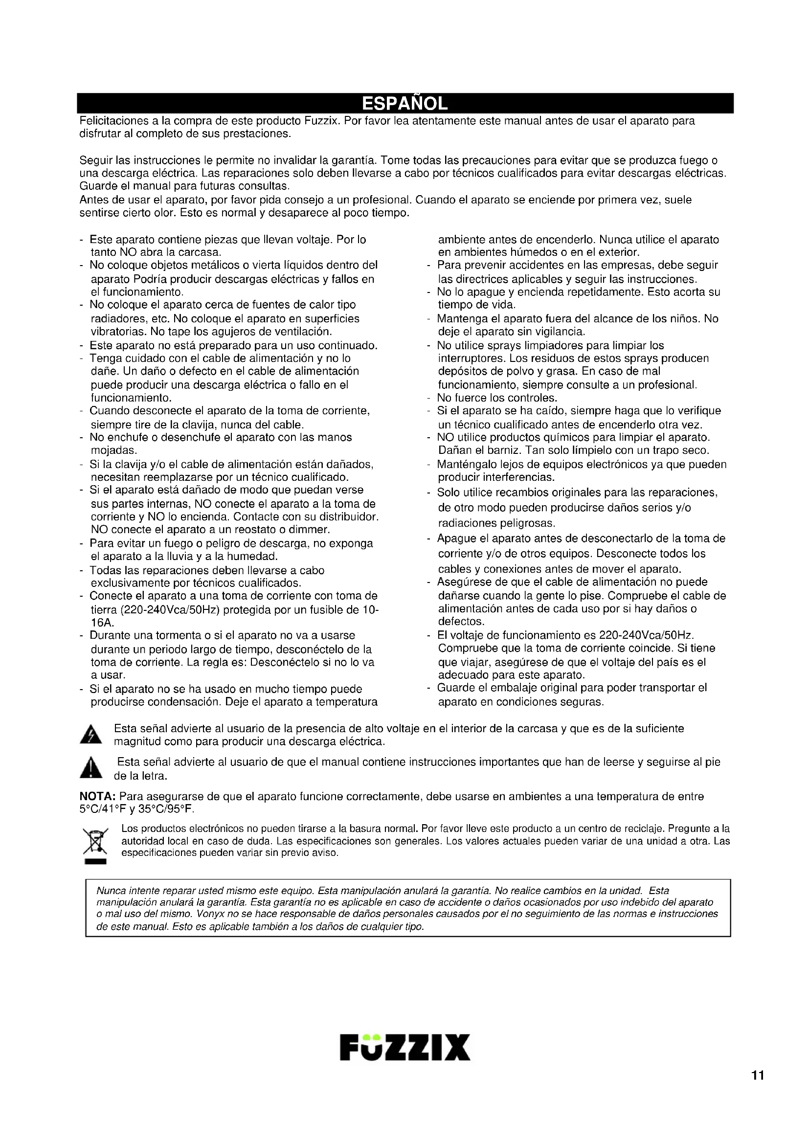 ESPAÑOL Felicitaciones a la compra de este producto Fuzzix. Por favor lea atentamente este manual antes de usar el aparato para disfrutar al completo de sus prestaciones. Seguir las instrucciones le permite no invalidar la garantía. Tome todas las precauciones para evitar que se produzca fuego o una descarga eléctrica. Las reparaciones solo deben llevarse a cabo por técnicos cualificados para evitar descargas eléctricas. Guarde el manual para futuras consultas. Antes de usar el aparato, por favor pida consejo a un profesional. Cuando el aparato se enciende por primera vez, suele sentirse cierto olor. Esto es normal y desaparece al poco tiempo. - Este aparato contiene piezas que llevan voltaje. Por lo tanto NO abra la carcasa. - No coloque objetos metálicos o vierta líquidos dentro del aparato Podría producir descargas eléctricas y fallos en el funcionamiento. - No coloque el aparato cerca de fuentes de calor tipo radiadores, etc. No coloque el aparato en superficies vibratorias. No tape los agujeros de ventilación. - Este aparato no está preparado para un uso continuado. - Tenga cuidado con el cable de alimentación y no lo dañe. Un daño o defecto en el cable de alimentación puede producir una descarga eléctrica o fallo en el funcionamiento. - Cuando desconecte el aparato de la toma de corriente, siempre tire de la clavija, nunca del cable. - No enchufe o desenchufe el aparato con las manos mojadas. - Si la clavija y/o el cable de alimentación están dañados, necesitan reemplazarse por un técnico cualificado. - Si el aparato está dañado de modo que puedan verse sus partes internas, NO conecte el aparato a la toma de corriente y NO lo encienda. Contacte con su distribuidor. NO conecte el aparato a un reostato o dimmer. - Para evitar un fuego o peligro de descarga, no exponga el aparato a la lluvia y a la humedad. - Todas las reparaciones deben llevarse a cabo exclusivamente por técnicos cualificados. - Conecte el aparato a una toma de corriente con toma de tierra (220-240Vca/50Hz) protegida por un fusible de 10- 16A. - Durante una tormenta o si el aparato no va a usarse durante un periodo largo de tiempo, desconéctelo de la toma de corriente. La regla es: Desconéctelo si no lo va a usar. - Si el aparato no se ha usado en mucho tiempo puede producirse condensación. Deje el aparato a temperatura ambiente antes de encenderlo. Nunca utilice el aparato en ambientes húmedos o en el exterior. - Para prevenir accidentes en las empresas, debe seguir las directrices aplicables y seguir las instrucciones. - No lo apague y encienda repetidamente. Esto acorta su tiempo de vida. - Mantenga el aparato fuera del alcance de los niños. No deje el aparato sin vigilancia. - No utilice sprays limpiadores para limpiar los interruptores. Los residuos de estos sprays producen depósitos de polvo y grasa. En caso de mal funcionamiento, siempre consulte a un profesional. - No fuerce los controles. - Si el aparato se ha caído, siempre haga que lo verifique un técnico cualificado antes de encenderlo otra vez. - NO utilice productos químicos para limpiar el aparato. Dañan el barniz. Tan solo límpielo con un trapo seco. - Manténgalo lejos de equipos electrónicos ya que pueden producir interferencias. - Solo utilice recambios originales para las reparaciones, de otro modo pueden producirse daños serios y/o radiaciones peligrosas. - Apague el aparato antes de desconectarlo de la toma de corriente y/o de otros equipos. Desconecte todos los cables y conexiones antes de mover el aparato. - Asegúrese de que el cable de alimentación no puede dañarse cuando la gente lo pise. Compruebe el cable de alimentación antes de cada uso por si hay daños o defectos. - El voltaje de funcionamiento es 220-240Vca/50Hz. Compruebe que la toma de corriente coincide. Si tiene que viajar, asegúrese de que el voltaje del país es el adecuado para este aparato. - Guarde el embalaje original para poder transportar el aparato en condiciones seguras. Esta señal advierte al usuario de la presencia de alto voltaje en el interior de la carcasa y que es de la suficiente magnitud como para producir una descarga eléctrica. Esta señal advierte al usuario de que el manual contiene instrucciones importantes que han de leerse y seguirse al pie de la letra. NOTA: Para asegurarse de que el aparato funcione correctamente, debe usarse en ambientes a una temperatura de entre 5°C/41°F y 35°C/95°F. Los productos electrónicos no pueden tirarse a la basura normal. Por favor lleve este producto a un centro de reciclaje. Pregunte a la autoridad local en caso de duda. Las especificaciones son generales. Los valores actuales pueden variar de una unidad a otra. Las especificaciones pueden variar sin previo aviso.