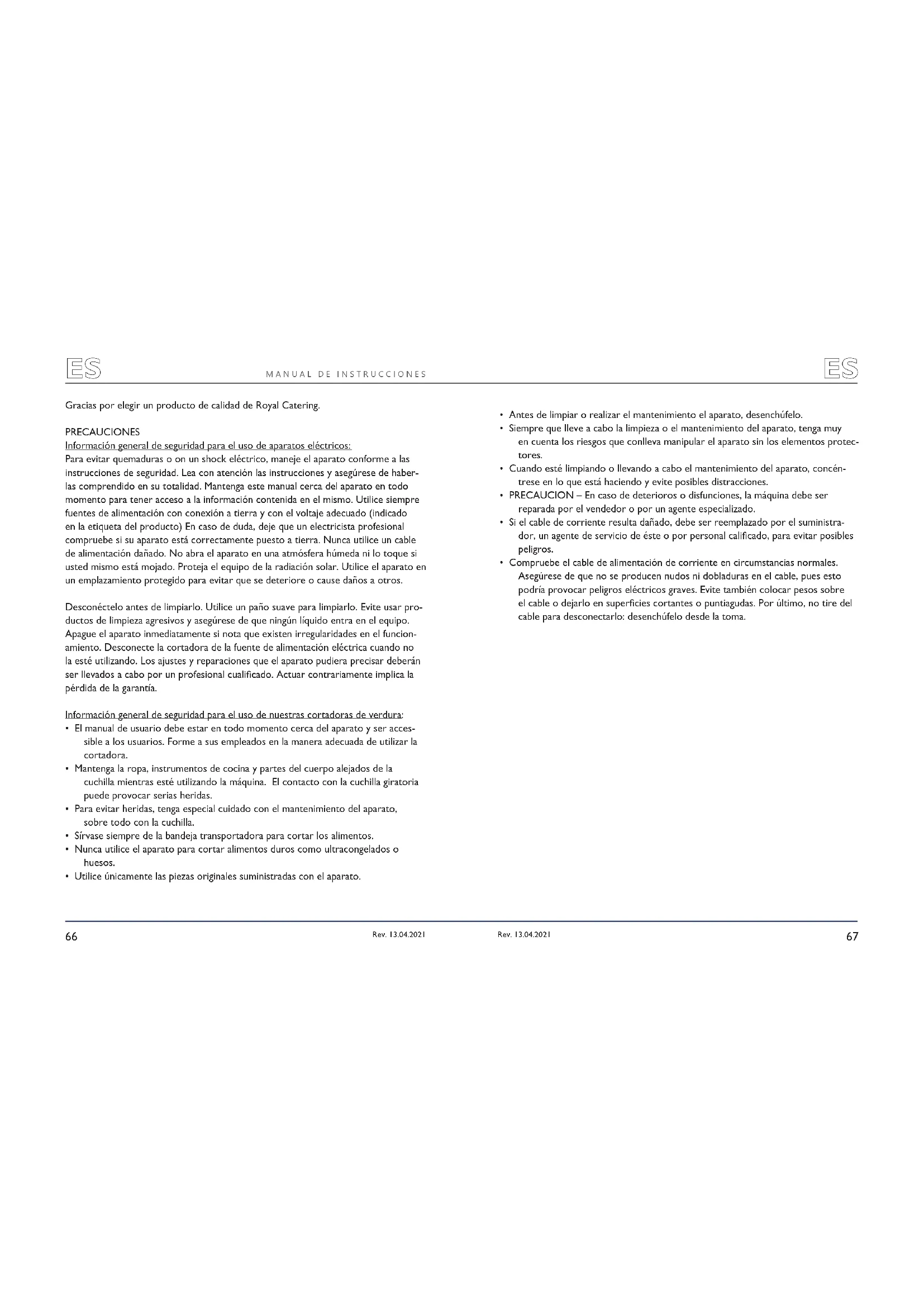 Rev. 13.04.2021Gracias por elegir un producto de calidad de Royal Catering. PRECAUCIONES Información general de seguridad para el uso de aparatos eléctricos: Para evitar quemaduras o on un shock eléctrico, maneje el aparato conforme a las instrucciones de seguridad. Lea con atención las instrucciones y asegúrese de haber- las comprendido en su totalidad. Mantenga este manual cerca del aparato en todo momento para tener acceso a la información contenida en el mismo. Utilice siempre fuentes de alimentación con conexión a tierra y con el voltaje adecuado (indicado en la etiqueta del producto) En caso de duda, deje que un electricista profesional compruebe si su aparato está correctamente puesto a tierra. Nunca utilice un cable de alimentación dañado. No abra el aparato en una atmósfera húmeda ni lo toque si usted mismo está mojado. Proteja el equipo de la radiación solar. Utilice el aparato en un emplazamiento protegido para evitar que se deteriore o cause daños a otros. Desconéctelo antes de limpiarlo. Utilice un paño suave para limpiarlo. Evite usar pro- ductos de limpieza agresivos y asegúrese de que ningún líquido entra en el equipo. Apague el aparato inmediatamente si nota que existen irregularidades en el funcion- amiento. Desconecte la cortadora de la fuente de alimentación eléctrica cuando no la esté utilizando. Los ajustes y reparaciones que el aparato pudiera precisar deberán ser llevados a cabo por un profesional cualicado. Actuar contrariamente implica la pérdida de la garantía. Información general de seguridad para el uso de nuestras cortadoras de verdura:
