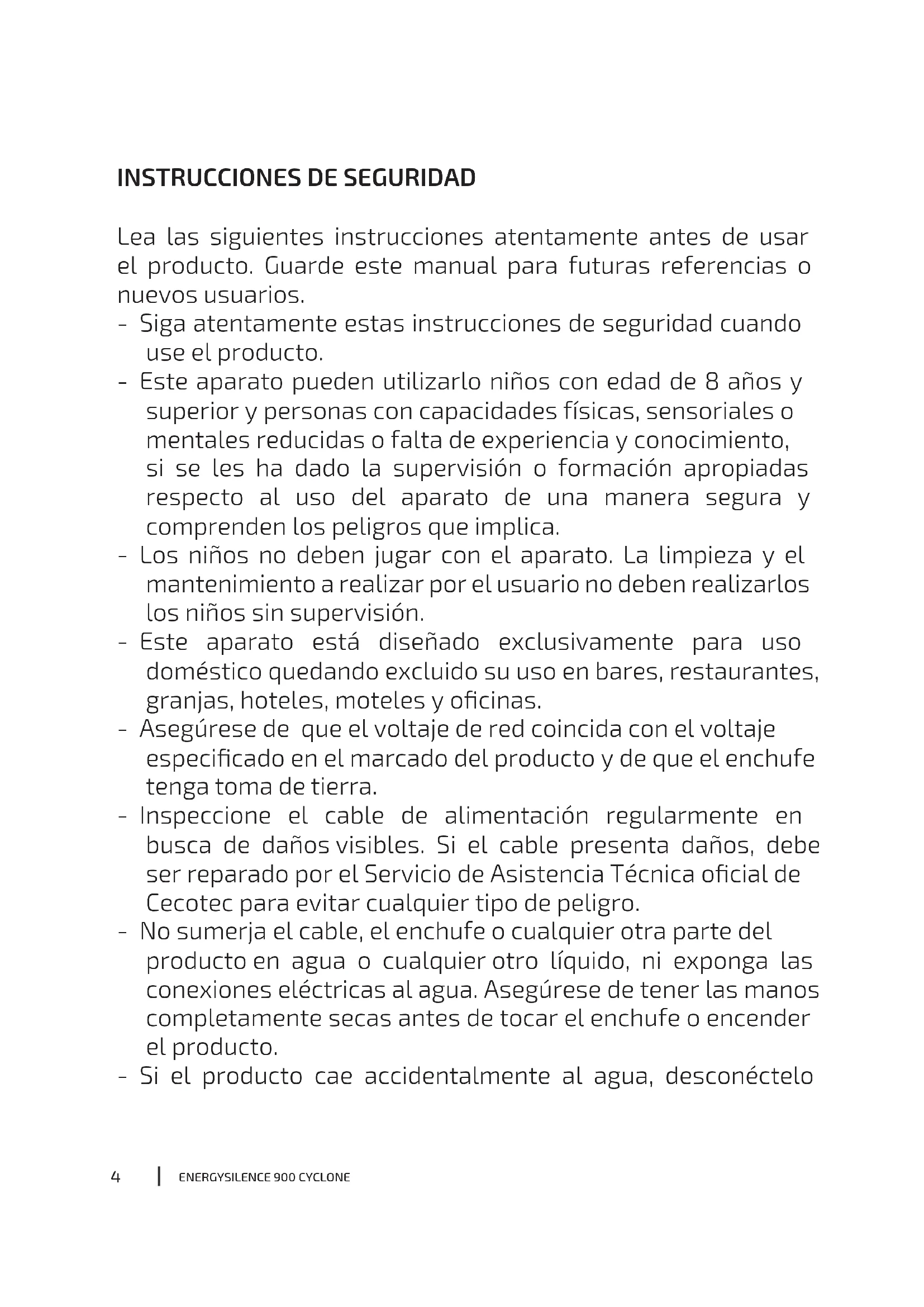 Lea las siguientes instrucciones atentamente antes de usar el producto. Guarde este manual para futuras referencias o nuevos usuarios. - Siga atentamente estas instrucciones de seguridad cuando use el producto. - Este aparato pueden utilizarlo niños con edad de 8 años y superior y personas con capacidades físicas, sensoriales o mentales reducidas o falta de experiencia y conocimiento, si se les ha dado la supervisión o formación apropiadas respecto al uso del aparato de una manera segura y comprenden los peligros que implica. - Los niños no deben jugar con el aparato. La limpieza y el mantenimiento a realizar por el usuario no deben realizarlos los niños sin supervisión. - Este aparato está diseñado exclusivamente para uso doméstico quedando excluido su uso en bares, restaurantes, granjas, hoteles, moteles y ocinas. - Asegúrese de que el voltaje de red coincida con el voltaje especicado en el marcado del producto y de que el enchufe tenga toma de tierra. - Inspeccione el cable de alimentación regularmente en busca de daños visibles. Si el cable presenta daños, debe ser reparado por el Servicio de Asistencia Técnica ocial de Cecotec para evitar cualquier tipo de peligro. - No sumerja el cable, el enchufe o cualquier otra parte del producto en agua o cualquier otro líquido, ni exponga las conexiones eléctricas al agua. Asegúrese de tener las manos completamente secas antes de tocar el enchufe o encender el producto. - Si el producto cae accidentalmente al agua, desconécteloENERGYSILENCE 900 CYCLONE