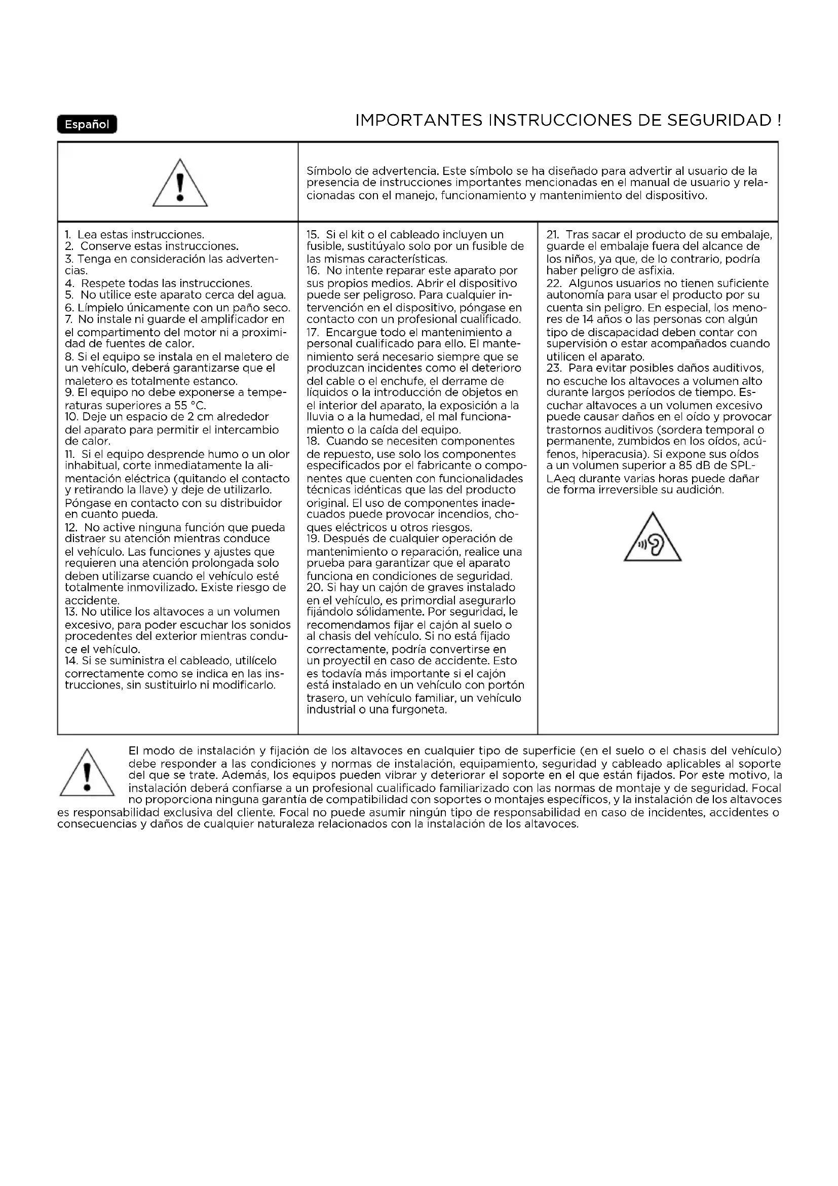 no escuche los altavoces a volumen alto durante largos períodos de tiempo. Es- cuchar altavoces a un volumen excesivo puede causar daños en el oído y provocar trastornos auditivos (sordera temporal o permanente, zumbidos en los oídos, acú- fenos, hiperacusia). Si expone sus oídos a un volumen superior a 85dB de SPL- LAeq durante varias horas puede dañar de forma irreversible su audición. El modo de instalación y fijación de los altavoces en cualquier tipo de superficie (en el suelo o el chasis del vehículo) debe responder a las condiciones y normas de instalación, equipamiento, seguridad y cableado aplicables al soporte del que se trate. Además, los equipos pueden vibrar y deteriorar el soporte en el que están fijados. Por este motivo, la instalación deberá confiarse a un profesional cualificado familiarizado con las normas de montaje y de seguridad. Focal no proporciona ninguna garantía de compatibilidad con soportes o montajes específicos, y la instalación de los altavoces es responsabilidad exclusiva del cliente. Focal no puede asumir ningún tipo de responsabilidad en caso de incidentes, accidentes o consecuencias y daños de cualquier naturaleza relacionados con la instalación de los altavoces.23