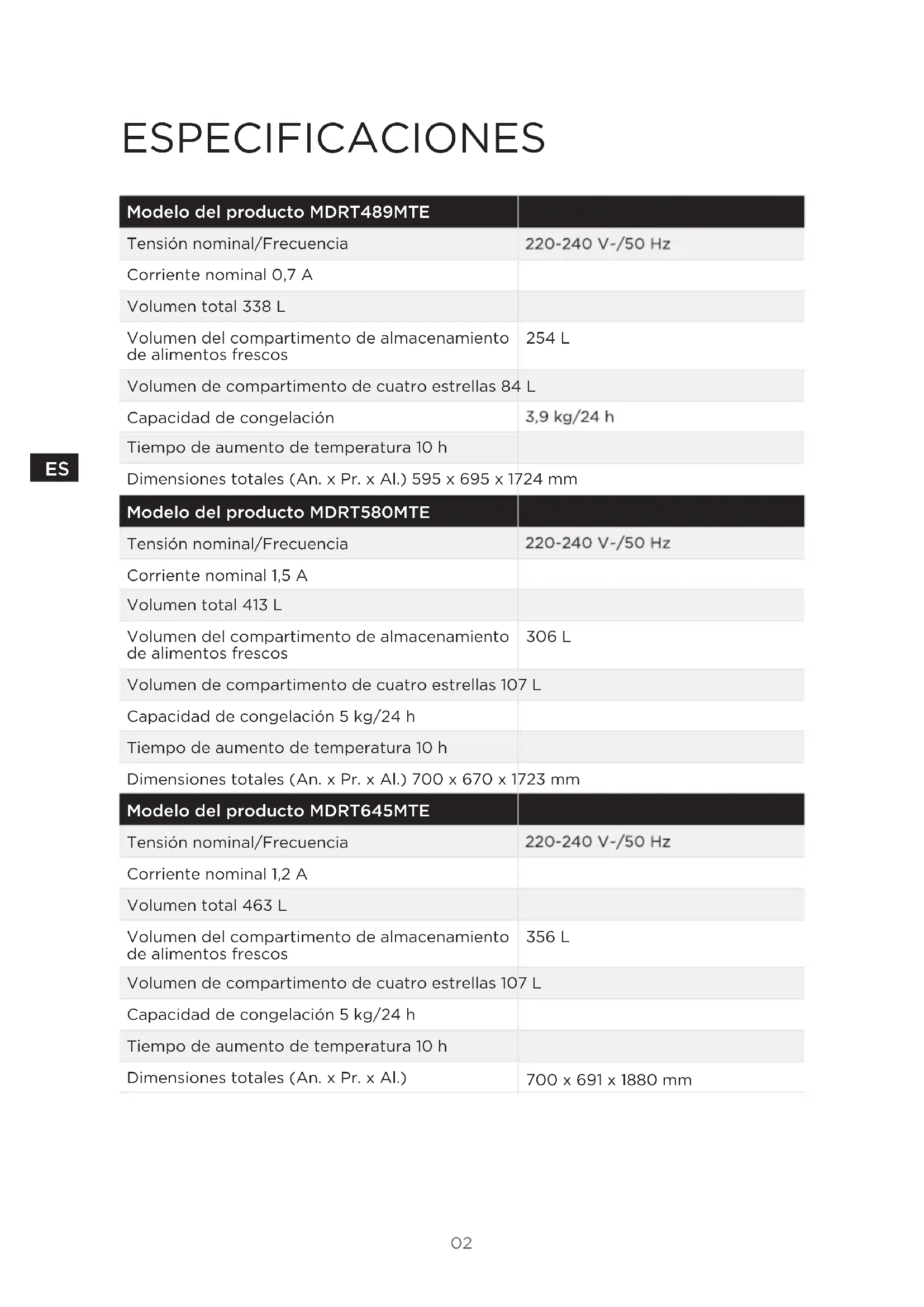 ESPECIFICACIONES Modelo del producto MDRT580MTE Tensión nominal/Frecuencia Corriente nominal 1,5 A Volumen total 413 L Volumen del compartimento de almacenamiento de alimentos frescos 306 L Volumen de compartimento de cuatro estrellas 107 L Capacidad de congelación 5 kg/24 h Tiempo de aumento de temperatura 10 h Dimensiones totales (An. x Pr. x Al.) 700 x 670 x 1723 mm Modelo del producto MDRT645MTE Tensión nominal/Frecuencia Corriente nominal 1,2 A Volumen total 463 L Volumen del compartimento de almacenamiento de alimentos frescos 356 L Volumen de compartimento de cuatro estrellas 107 L Capacidad de congelación 5 kg/24 h Tiempo de aumento de temperatura 10 h Dimensiones totales (An. x Pr. x Al.) Modelo del producto MDRT489MTE Tensión nominal/Frecuencia Corriente nominal 0,7 A Volumen total 338 L Volumen del compartimento de almacenamiento de alimentos frescos 254 L Volumen de compartimento de cuatro estrellas 84 L Capacidad de congelación Tiempo de aumento de temperatura 10 h Dimensiones totales (An. x Pr. x Al.) 595 x 695 x 1724 mm 700 x 691 x 1880 mm03