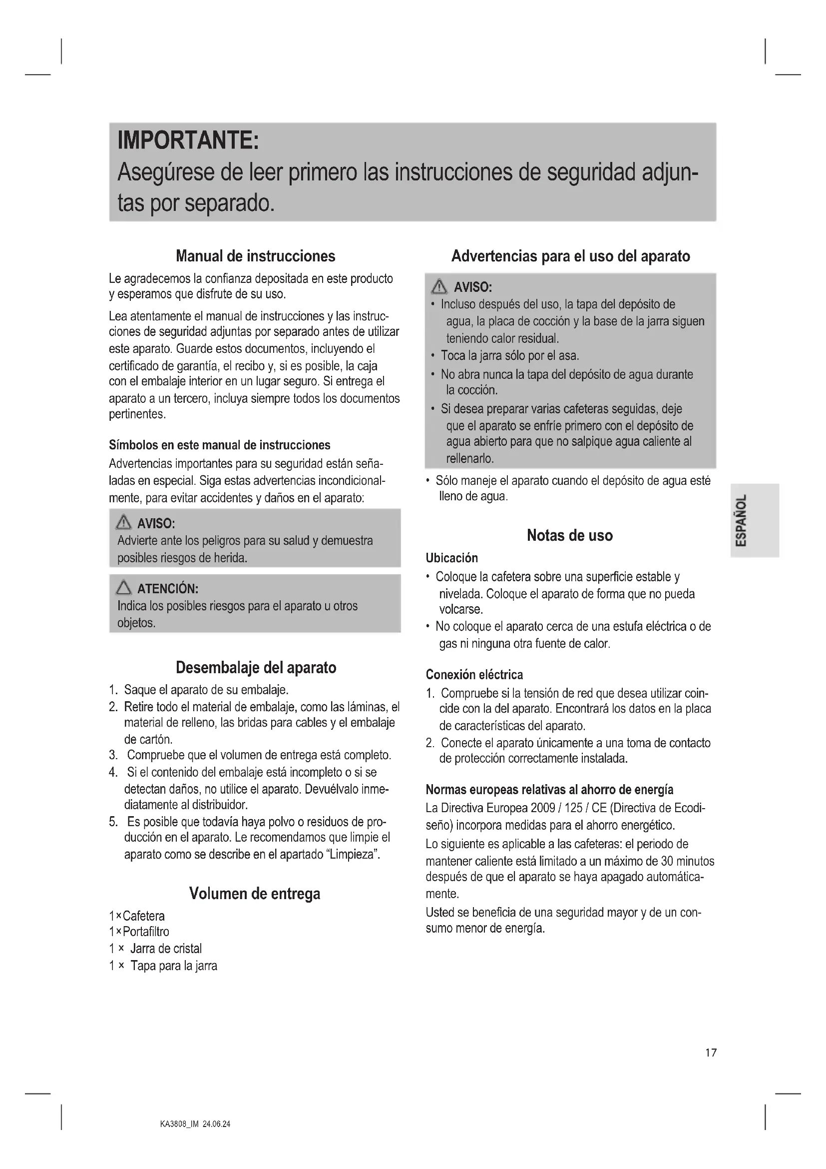 Datos técnicos Modelo: .....................................................................KA 3808 Alimentación: ......................................220 – 240 V~, 50 – 60 Hz Consumo de energía: ...................................................800 W Cantidad de llenado: ...................................... aprox. 1,5 litros Clase de protección: .............................................................. Peso neto: .......................................................... aprox. 1,4 kg El derecho de realizar modicaciones técnicas y de diseño en el curso del desarrollo continuo del producto esta reservado. Este aparato ha sido probado de acuerdo con todas las directivas CE vigentes y construido de acuerdo con las últimas normas de seguridad. Eliminación Significado del símbolo “Cubo de basura” Proteja nuestro medio ambiente, aparatos eléc- tricos no forman parte de la basura doméstica. Haga uso de los centros de recogida previstos para la eliminación de aparatos eléctricos y entregue allí sus aparatos eléctricos que no vaya a utilizar más. Ayudará en evitar las potenciales consecuencias, a causa de una errónea eliminación de desechos, para el medio ambiente y la salud humana. Con ello, contribuirá a la recuperación, al reciclado y a otras formas de reutilización de los aparatos viejos eléctricos y electrónicos. La información cómo se debe eliminar los aparatos, se obtiene en su ayuntamiento o su administración municipal. Su distribuidor y socio contractual también está obligado a recuperar el aparato antiguo sin coste alguno.KA3808_IM 24.06.24