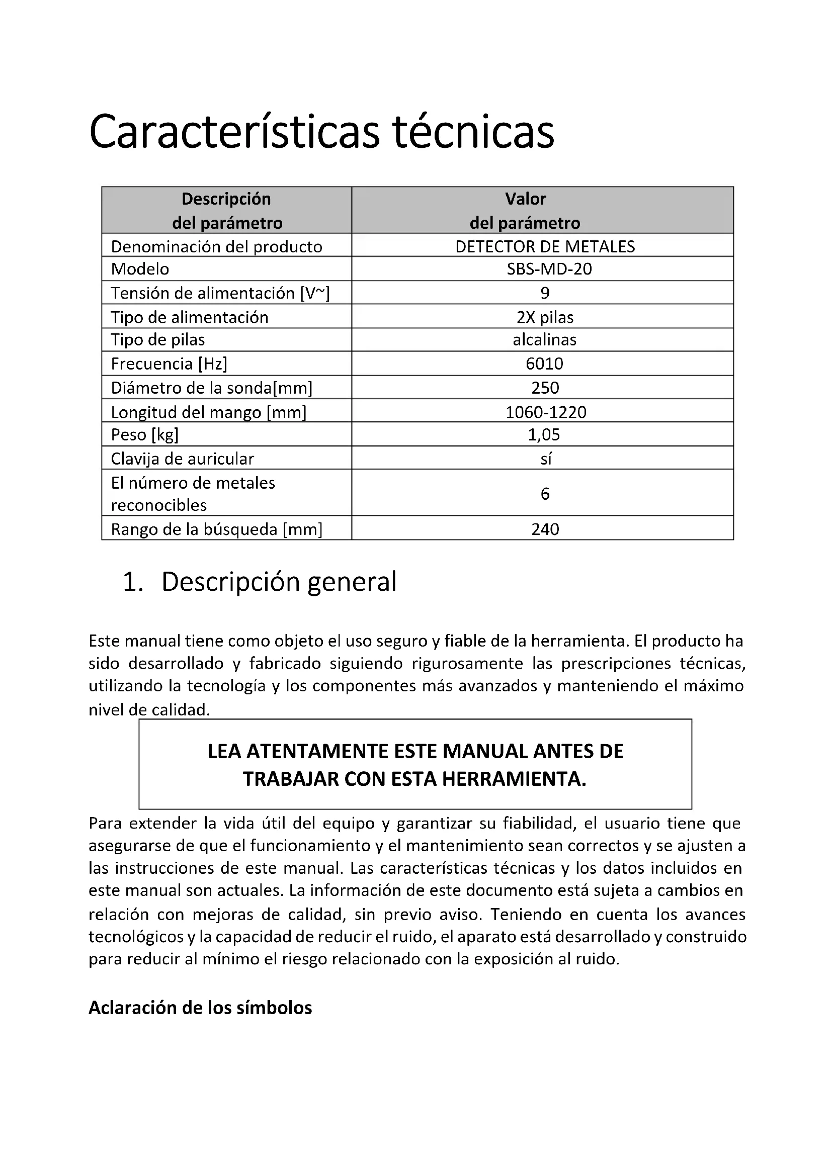 j) No dejar las pilas en el dispositivo, cuando no se va a utilizar durante un periodo prolongado. k) No limpie el equipo con sustancias ácidas, productos médicos, diluyentes, combustible, aceites u otras sustancias químicas; esto puede dañar el equipo. INSTRUCCIONES DE ELIMINACIÓN SEGURA DE PILAS RECARGABLES Y NO RECARGABLES. En el equipo se debe instalar 2 baterías 9V. Las pilas usadas se pueden sacar del dispositivo de la forma inversa a su instalación. Entregar las pilas a un punto de recogida autorizado. ELIMINACIÓN DE DISPOSITIVOS USADOS. Al final de su vida útil, este producto no debe desecharse con la basura doméstica normal, sino que debe llevarse a un punto de recogida para el reciclaje de aparatos eléctricos y electrónicos. Lo informa el símbolo ubicado en el producto, en las instrucciones de uso o en el embalaje. Los materiales utilizados en este equipo son reciclables de acuerdo con su marcado. Se contribuye de forma importante a la protección del medio ambiente reutilizando, reciclando o eliminando de otra forma los equipos usados. La administración local le proporcionará información sobre el punto adecuado para desechar los equipos usados.RESOLUCIÓN DE PROBLEMAS Problema Posible causa Medida El detector muestra la lectura o emite sonido sin detectar el objetivo. El detector puede recibir las interferencias y falsos señales de la antena transmisora y otras líneas eléctricas. Cambiar el lugar de búsqueda. Espere un tiempo y vuelva a intentar. Humedad ambiental demasiado alta. El detector emite señales falsas. Sensibilidad demasiado alta interferencias electromagnéticas del entorno Reducir la sensibilidad. Configuración de la sonda del detector demasiado rápido o en el ángulo equivocado Mover más lento la sonda y sujetar correctamente el detector. El uso de los 2 detectores a poca distancia uno del otro. Mantener dos detectores a una distancia de al menos 6 metros el uno al otro. Sonda no detecta nada. Sensibilidad configurada es demasiado baja. Aumentar la sensibilidad. La sonda no está ubicada en paralelo al suelo Colocar la sonda en paralelo al suelo. La pantalla indica varios objetivos al mismo tiempo o emite varios sonidos simultáneamente. El detector ha encontrado un par de diferentes objetos metálicos. Para eliminar la detección de los objetos situados en mayor profundidad se debe reducir la sensibilidad. El detector no puede identificar el objetivo. A veces, el metal oxidado también produce la indicación de otro objetivo y tono. Mover la sonda en diferentes ángulos. Detector no funciona. El cable de 5 pines no está conectado correctamente. Conectar el cable correctamente. Batería descargada. Reemplazar la batería.Műszaki adatok Paraméter értéke: Paraméter értéke: Termék neve FÉMDETEKTOR Modell SBS-MD-20 Tápfeszültség [V~]