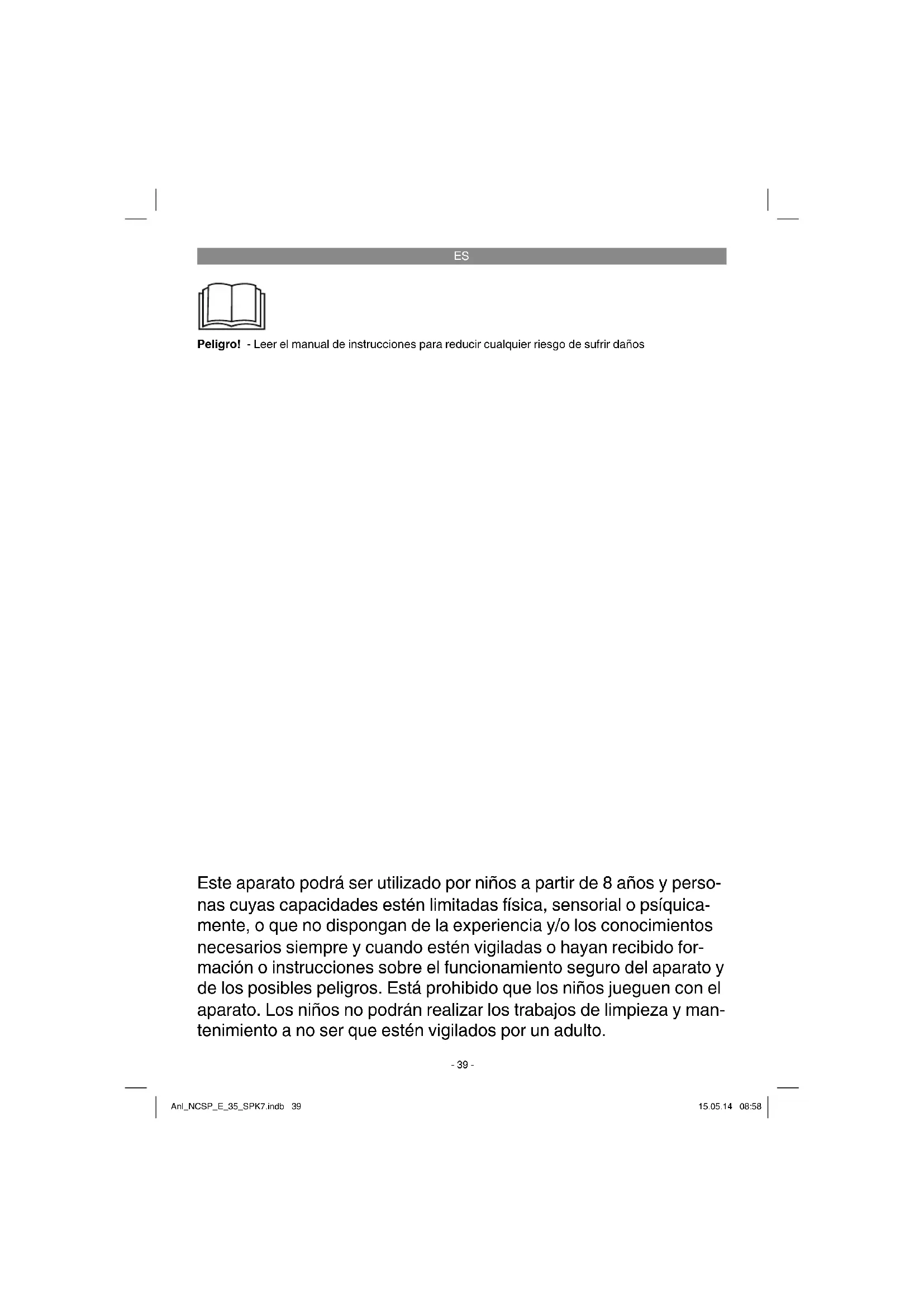 Peligro! - Leer el manual de instrucciones para reducir cualquier riesgo de sufrir daños Este aparato podrá ser utilizado por niños a partir de 8 años y perso- nas cuyas capacidades estén limitadas física, sensorial o psíquica- mente, o que no dispongan de la experiencia y/o los conocimientos necesarios siempre y cuando estén vigiladas o hayan recibido for- mación o instrucciones sobre el funcionamiento seguro del aparato y de los posibles peligros. Está prohibido que los niños jueguen con el aparato. Los niños no podrán realizar los trabajos de limpieza y man- tenimiento a no ser que estén vigilados por un adulto. Anl_NCSP_E_35_SPK7.indb 39Anl_NCSP_E_35_SPK7.indb 39 15.05.14 08:5815.05.14 08:58ES
