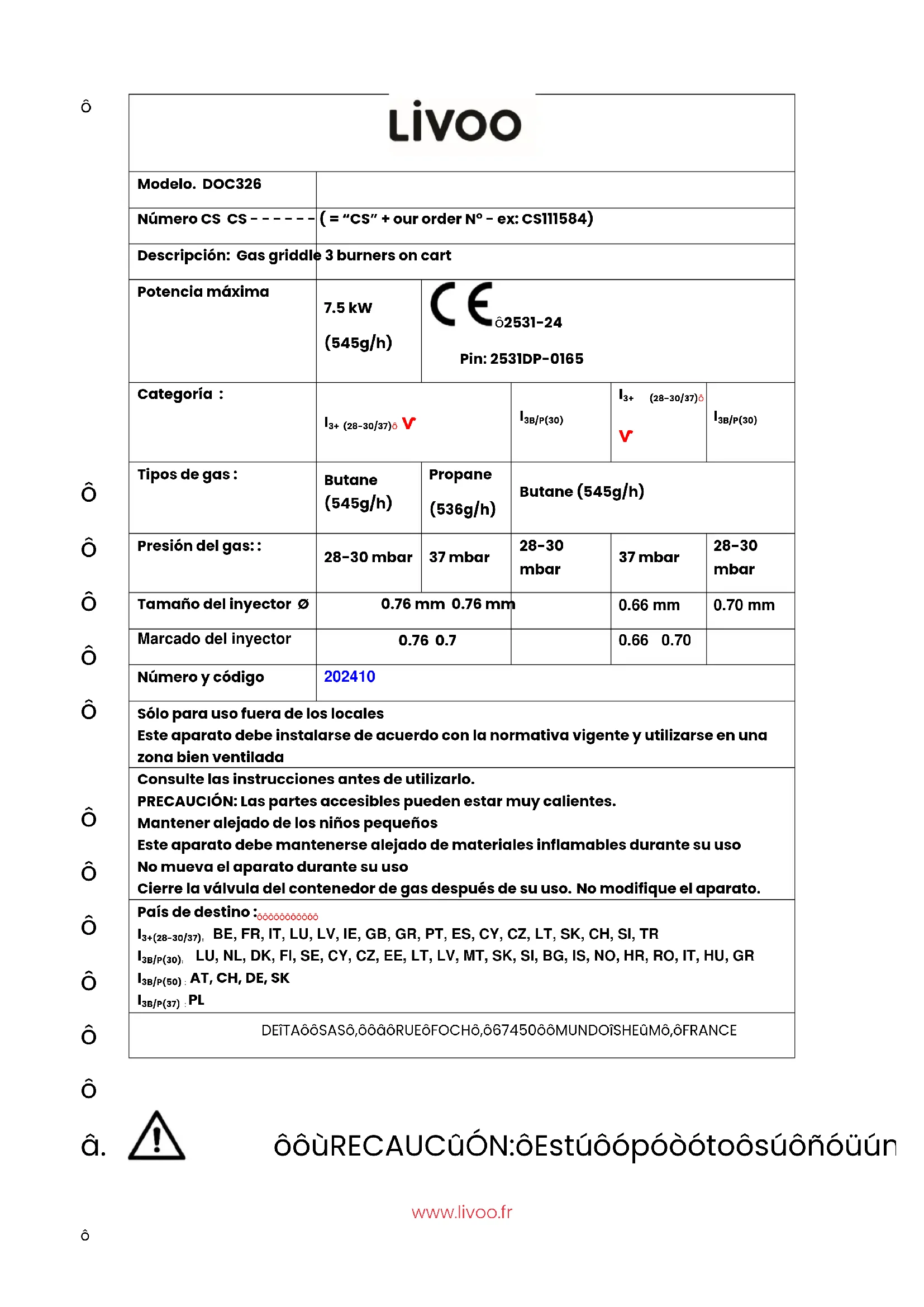 Modelo. DOC326 Número CS CS - - - - - - ( = “CS” + our order N° - ex: CS111584) Descripción: Gas griddle 3 burners on cart Potencia máxima 7.5 kW (545g/h) 2531-24 Pin: 2531DP-0165 Categoría :