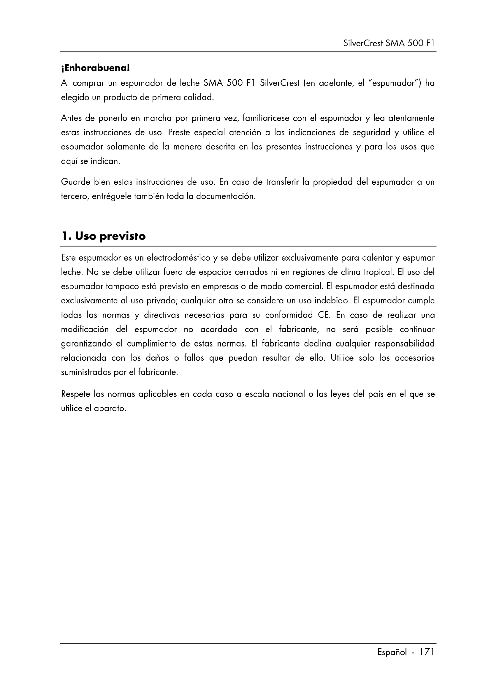 13. Información sobre la garantía .................................................................. 192SilverCrest SMA 500 F1 Español - 171 ¡Enhorabuena! Al comprar un espumador de leche SMA 500 F1 SilverCrest (en adelante, el “espumador”) ha elegido un producto de primera calidad. Antes de ponerlo en marcha por primera vez, familiarícese con el espumador y lea atentamente estas instrucciones de uso. Preste especial atención a las indicaciones de seguridad y utilice el espumador solamente de la manera descrita en las presentes instrucciones y para los usos que aquí se indican. Guarde bien estas instrucciones de uso. En caso de transferir la propiedad del espumador a un tercero, entréguele también toda la documentación.