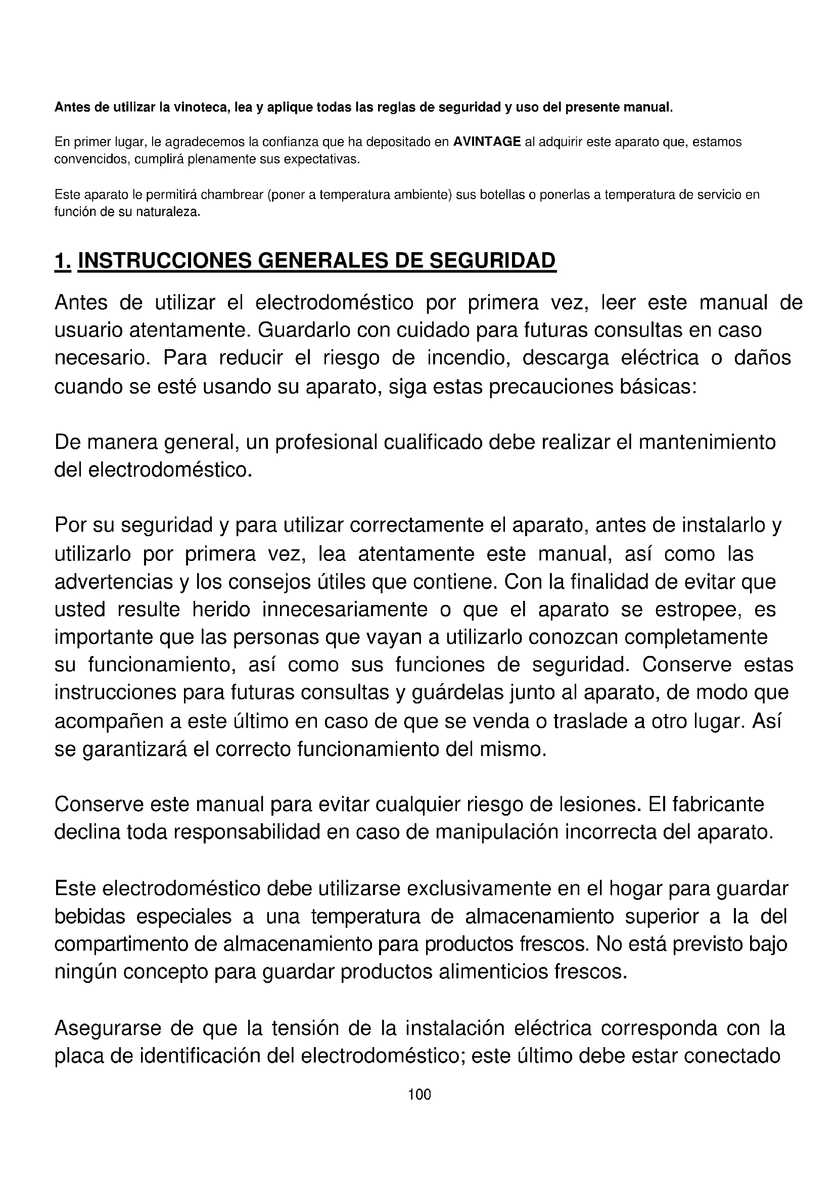 Antes de utilizar el electrodoméstico por primera vez, leer este manual de usuario atentamente. Guardarlo con cuidado para futuras consultas en caso necesario. Para reducir el riesgo de incendio, descarga eléctrica o daños cuando se esté usando su aparato, siga estas precauciones básicas: De manera general, un profesional cualificado debe realizar el mantenimiento del electrodoméstico. Por su seguridad y para utilizar correctamente el aparato, antes de instalarlo y utilizarlo por primera vez, lea atentamente este manual, así como las advertencias y los consejos útiles que contiene. Con la finalidad de evitar que usted resulte herido innecesariamente o que el aparato se estropee, es importante que las personas que vayan a utilizarlo conozcan completamente su funcionamiento, así como sus funciones de seguridad. Conserve estas instrucciones para futuras consultas y guárdelas junto al aparato, de modo que acompañen a este último en caso de que se venda o traslade a otro lugar. Así se garantizará el correcto funcionamiento del mismo. Conserve este manual para evitar cualquier riesgo de lesiones. El fabricante declina toda responsabilidad en caso de manipulación incorrecta del aparato. Este electrodoméstico debe utilizarse exclusivamente en el hogar para guardar bebidas especiales a una temperatura de almacenamiento superior a la del compartimento de almacenamiento para productos frescos. No está previsto bajo ningún concepto para guardar productos alimenticios frescos. Asegurarse de que la tensión de la instalación eléctrica corresponda con la placa de identificación del electrodoméstico; este último debe estar conectado101