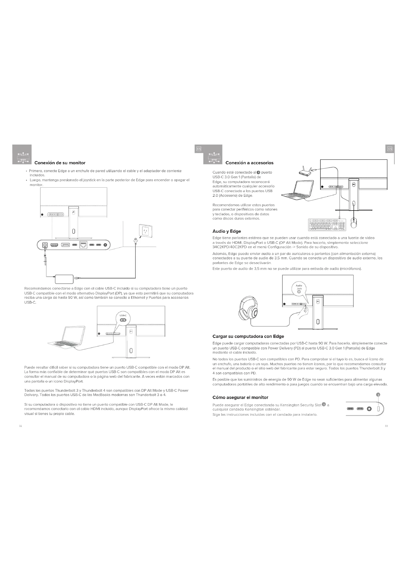 Recomendamos utilizar estos puertos para conectar periféricos como ratones y teclados, o dispositivos de datos como discos duros externos. Edge tiene parlantes estéreo que se pueden usar cuando está conectado a una fuente de video a través de HDMI, DisplayPort o USB-C (DP Alt Mode). Para hacerlo, simplemente seleccione 34C2KPD/40C2KPD en el menú Configuración -> Sonido de su dispositivo. Además, Edge puede enviar audio a un par de auriculares o parlantes (con alimentación externa) conectados a su puerto de audio de 3,5 mm. Cuando se conecta un dispositivo de audio externo, los parlantes de Edge se desactivarán. Este puerto de audio de 3,5 mm no se puede utilizar para entrada de audio (micrófonos). Edge puede cargar computadoras conectadas por USB-C hasta 90 W. Para hacerlo, simplemente conecte un puerto USB-C compatible con Power Delivery (PD) al puerto USB-C 3.0 Gen 1 (Pantalla) de Edge mediante el cable incluido. No todos los puertos USB-C son compatibles con PD. Para comprobar si el tuyo lo es, busca el ícono de un enchufe, una batería o un rayo. Muchos puertos no tienen íconos, por lo que recomendamos consultar el manual del producto o el sitio web del fabricante para estar seguro. Todos los puertos Thunderbolt 3 y 4 son compatibles con PD. Es posible que los suministros de energía de 90 W de Edge no sean suficientes para alimentar algunas computadoras portátiles de alto rendimiento o para juegos cuando se encuentran bajo una carga elevada. Audio Jack