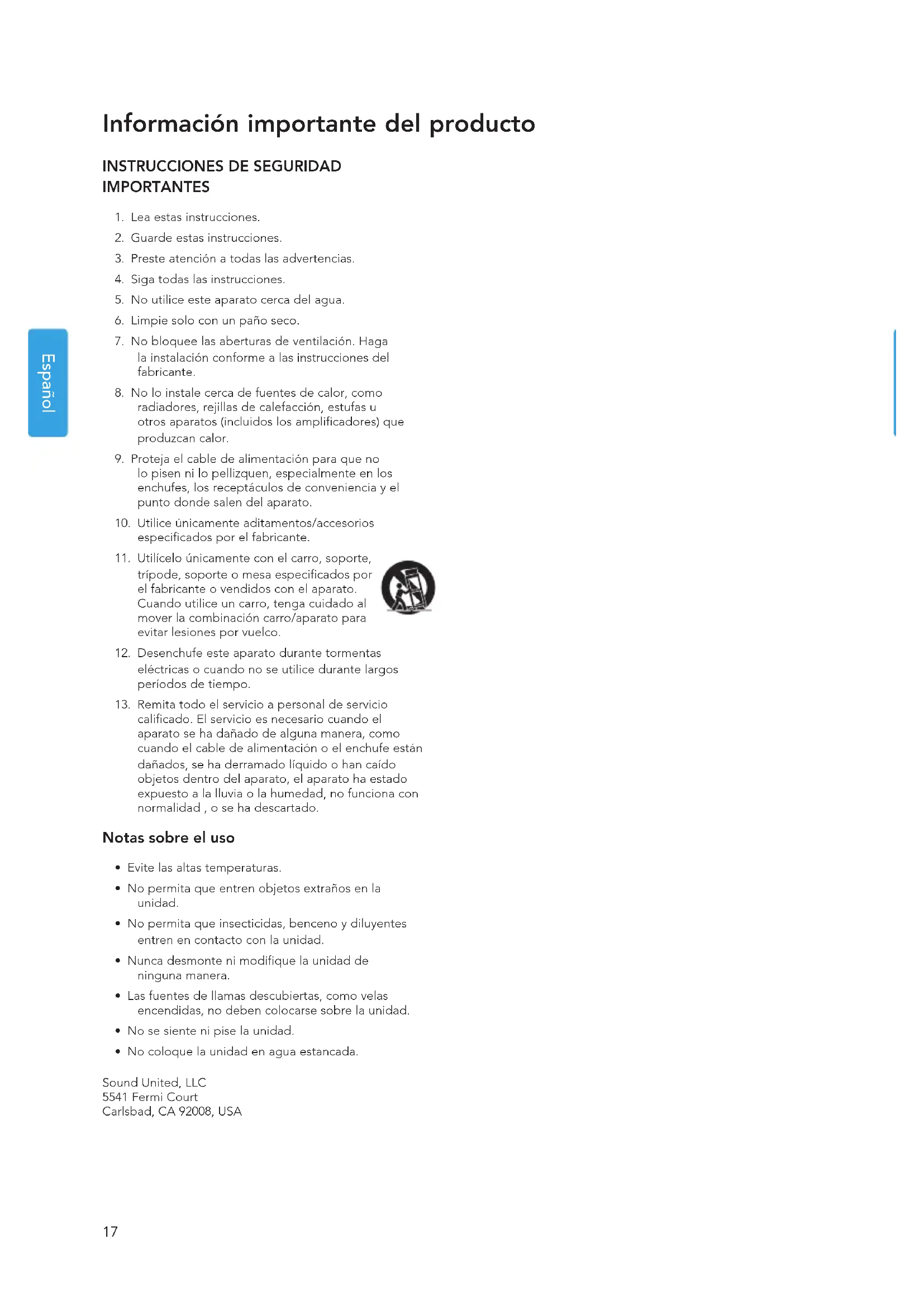 trípode, soporte o mesa especificados por el fabricante o vendidos con el aparato. Cuando utilice un carro, tenga cuidado al mover la combinación carro/aparato para evitar lesiones por vuelco.