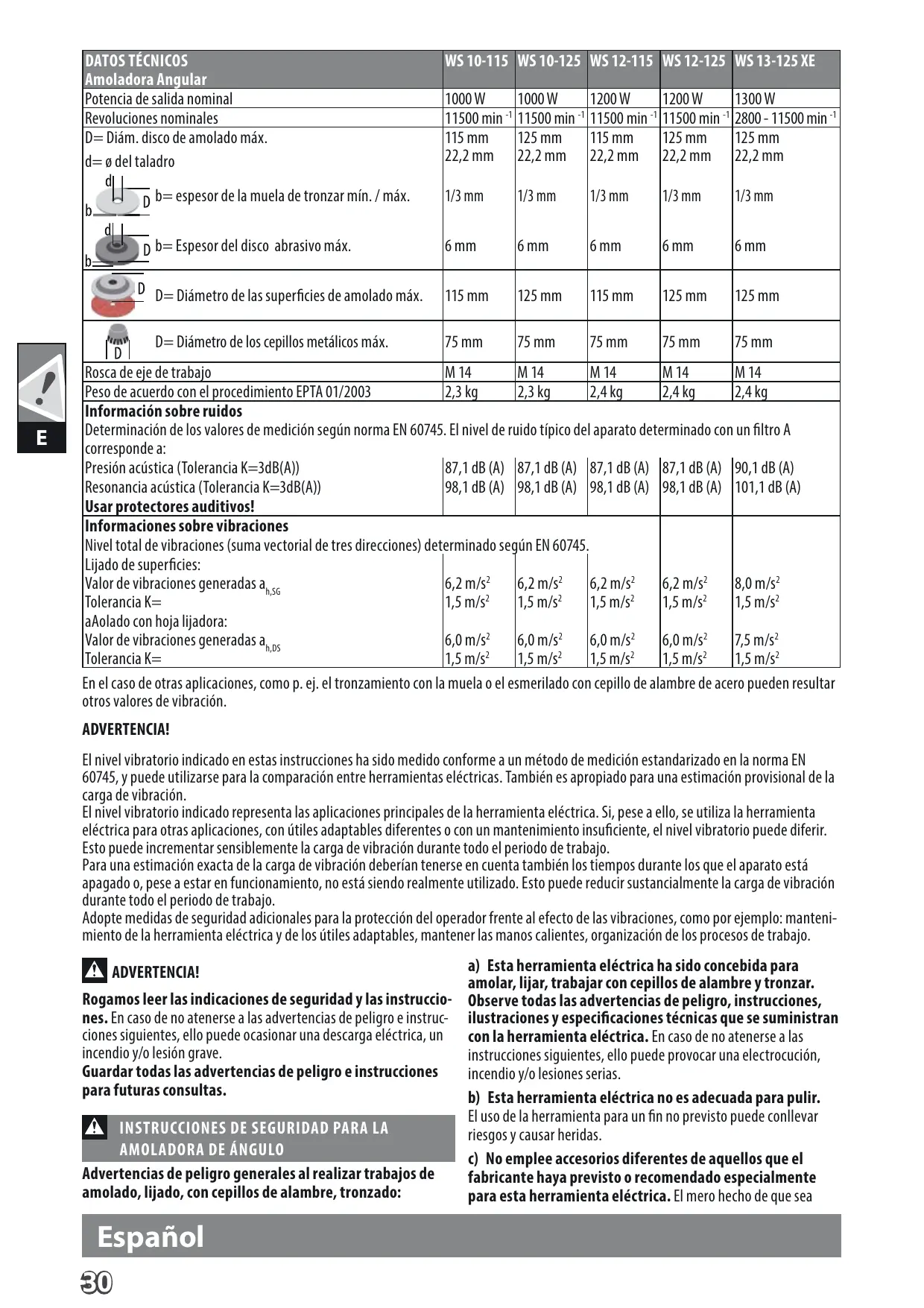 Tolerancia K= 1,5 m/s 1,5 m/s 1,5 m/s 1,5 m/s 1,5 m/s2 aAolado con hoja lijadora: 6,0 m/s2 6,0 m/s2 6,0 m/s2 6,0 m/s2 7,5 m/s2 Valor de vibraciones generadas ah,DS Tolerancia K= 1,5 m/s2 1,5 m/s2 1,5 m/s2 1,5 m/s2 1,5 m/s2 En el caso de otras aplicaciones, como p. ej. el tronzamiento con la muela o el esmerilado con cepillo de alambre de acero pueden resultar otros valores de vibración. ADVERTENCIA! El nivel vibratorio indicado en estas instrucciones ha sido medido conforme a un método de medición estandarizado en la norma EN 60745, y puede utilizarse para la comparación entre herramientas eléctricas. También es apropiado para una estimación provisional de la carga de vibración. El nivel vibratorio indicado representa las aplicaciones principales de la herramienta eléctrica. Si, pese a ello, se utiliza la herramienta eléctrica para otras aplicaciones, con útiles adaptables diferentes o con un mantenimiento insuficiente, el nivel vibratorio puede diferir. Esto puede incrementar sensiblemente la carga de vibración durante todo el periodo de trabajo. Para una estimación exacta de la carga de vibración deberían tenerse en cuenta también los tiempos durante los que el aparato está apagado o, pese a estar en funcionamiento, no está siendo realmente utilizado. Esto puede reducir sustancialmente la carga de vibración durante todo el periodo de trabajo. Adopte medidas de seguridad adicionales para la protección del operador frente al efecto de las vibraciones, como por ejemplo: mantenimiento de la herramienta eléctrica y de los útiles adaptables, mantener las manos calientes, organización de los procesos de trabajo. a) Esta herramienta eléctrica ha sido concebida para amolar, lijar, trabajar con cepillos de alambre y tronzar. Rogamos leer las indicaciones de seguridad y las instruccio- Observe todas las advertencias de peligro, instrucciones, nes. En caso de no atenerse a las advertencias de peligro e instruc- ilustraciones y especificaciones técnicas que se suministran ciones siguientes, ello puede ocasionar una descarga eléctrica, un con la herramienta eléctrica. En caso de no atenerse a las incendio y/o lesión grave. instrucciones siguientes, ello puede provocar una electrocución, Guardar todas las advertencias de peligro e instrucciones incendio y/o lesiones serias. para futuras consultas. b) Esta herramienta eléctrica no es adecuada para pulir. El uso de la herramienta para un fin no previsto puede conllevar