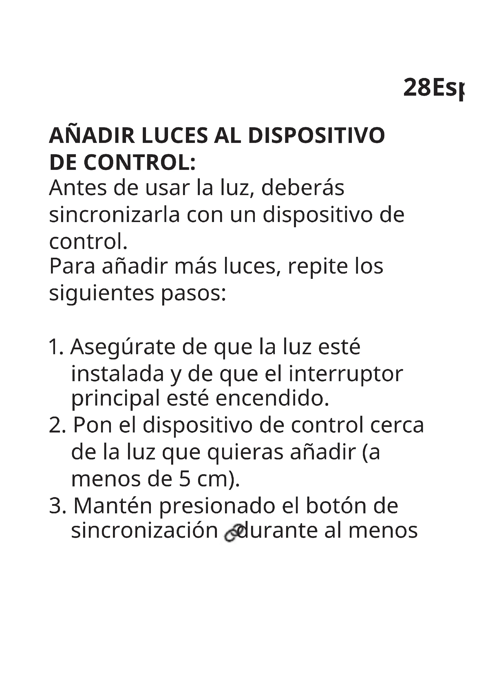 sincronización durante al menos29 10 segundos. Se encenderá una luz roja en el dispositivo de control. Tu luz empezará a atenuarse y nalmente brillará una vez para indicar que ha sido correctamente sincronizada. Se pueden sincronizar hasta 10 luces en un mismo dispositivo de control. Asegúrate de sincronizarlas de una en una. Si las luces están cerca las unas de las otras, desconecta del interruptor principal las que ya han sido sincronizadas.30 ATENCIÓN: