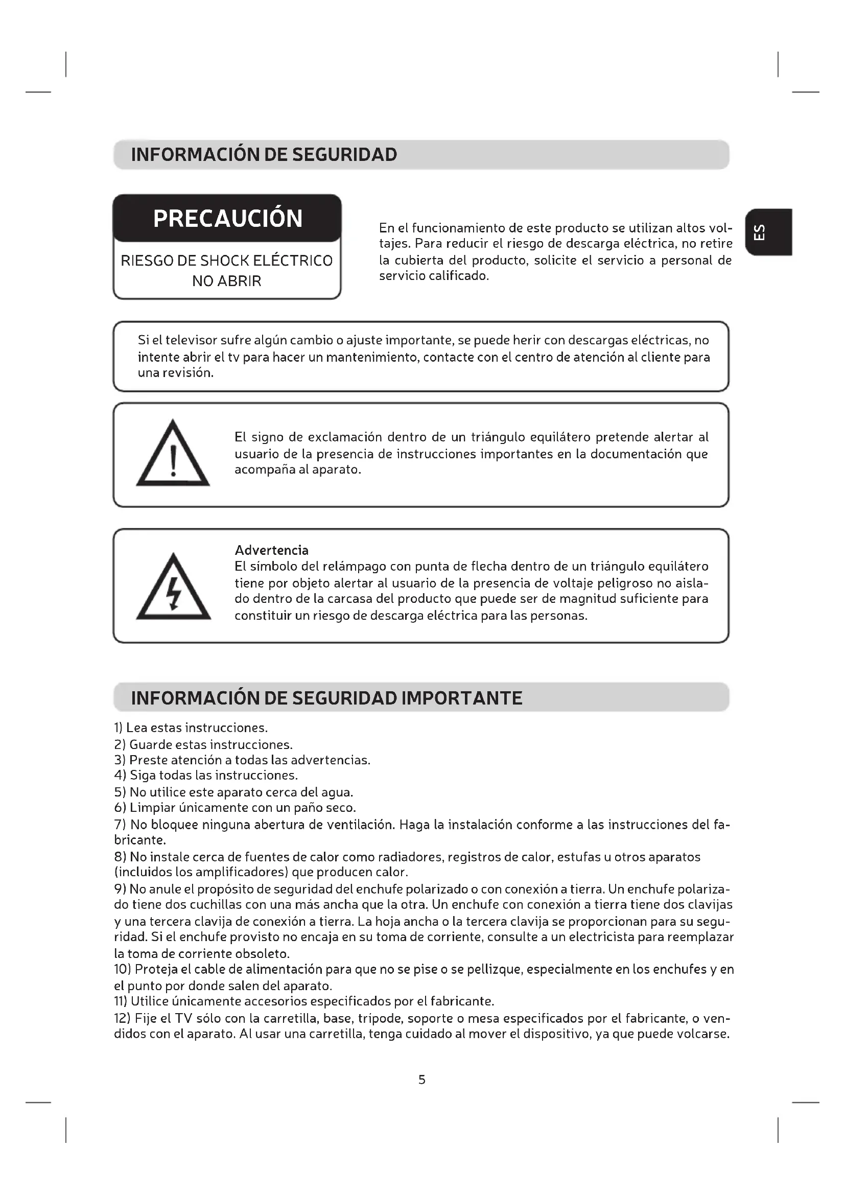 - Información de seguridad importante . . . . . . . . . . . . . . . . . . . . . . . . . . . . . . . . . . . . . . . . . . . . . . . . . 5 Instalación y Conexión TV