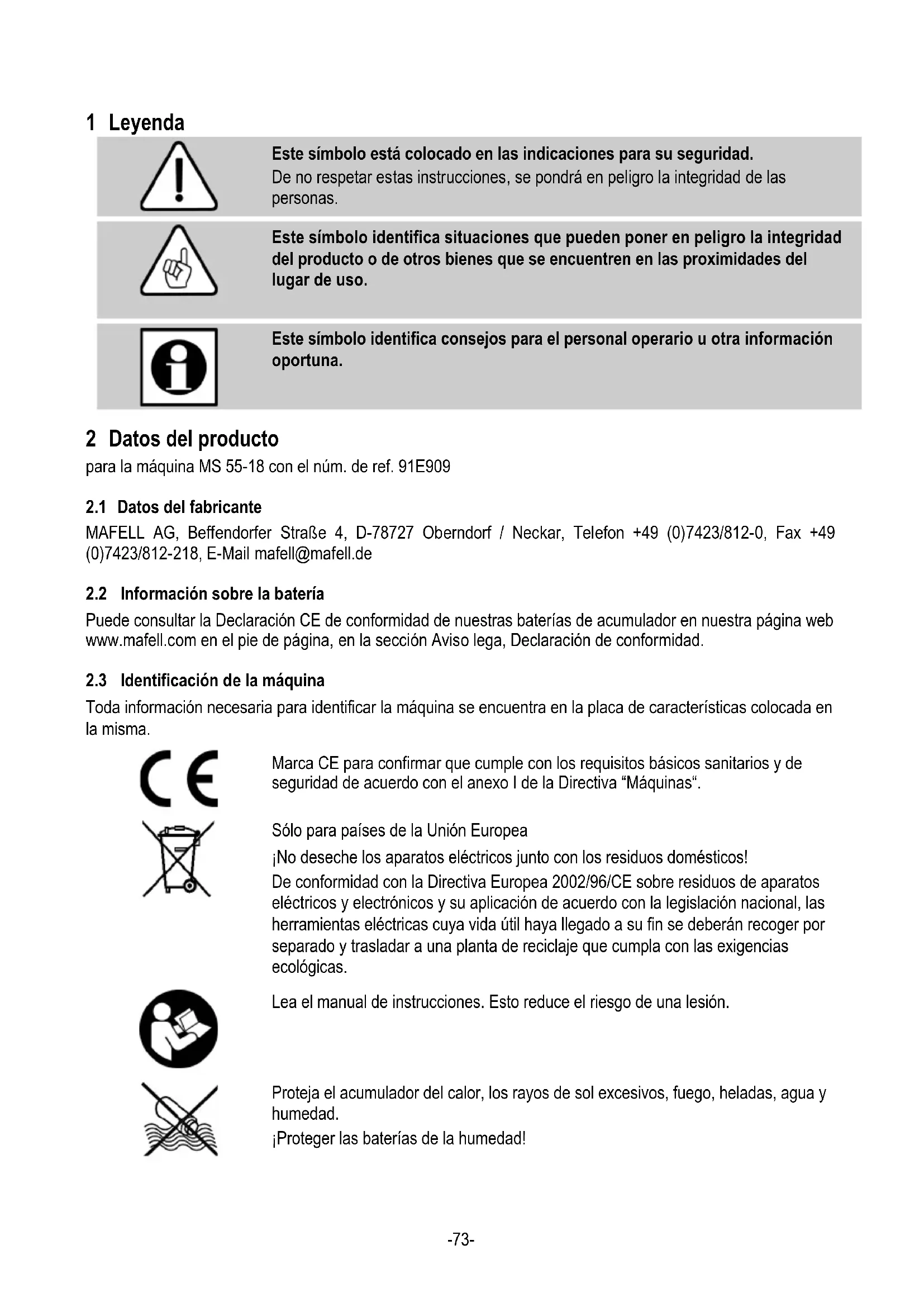 Puede consultar la Declaración CE de conformidad de nuestras baterías de acumulador en nuestra página web www.mafell.com en el pie de página, en la sección Aviso lega, Declaración de conformidad.