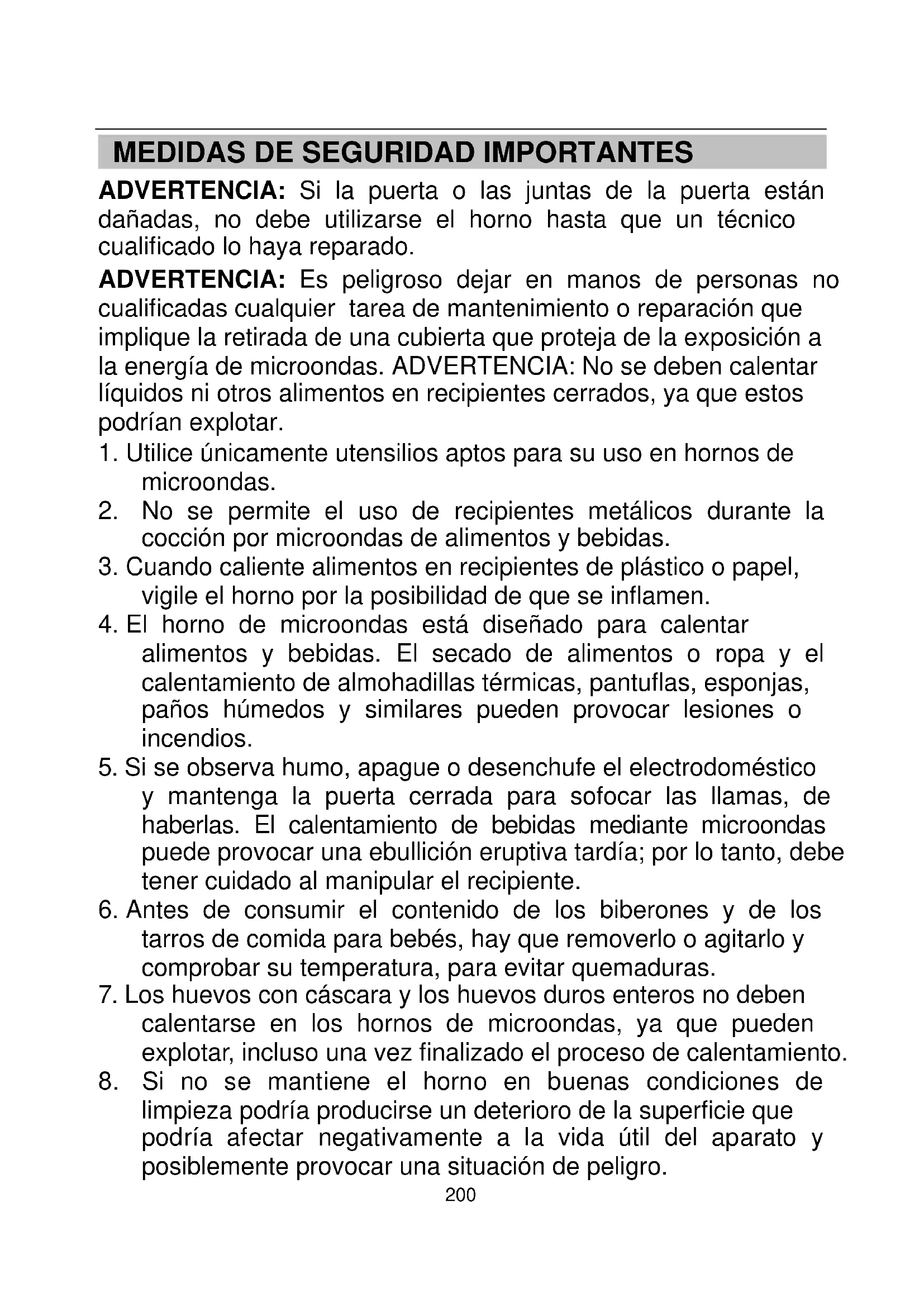 ADVERTENCIA: Si la puerta o las juntas de la puerta están dañadas, no debe utilizarse el horno hasta que un técnico cualificado lo haya reparado. ADVERTENCIA: Es peligroso dejar en manos de personas no cualificadas cualquier tarea de mantenimiento o reparación que implique la retirada de una cubierta que proteja de la exposición a la energía de microondas. ADVERTENCIA: No se deben calentar líquidos ni otros alimentos en recipientes cerrados, ya que estos podrían explotar.