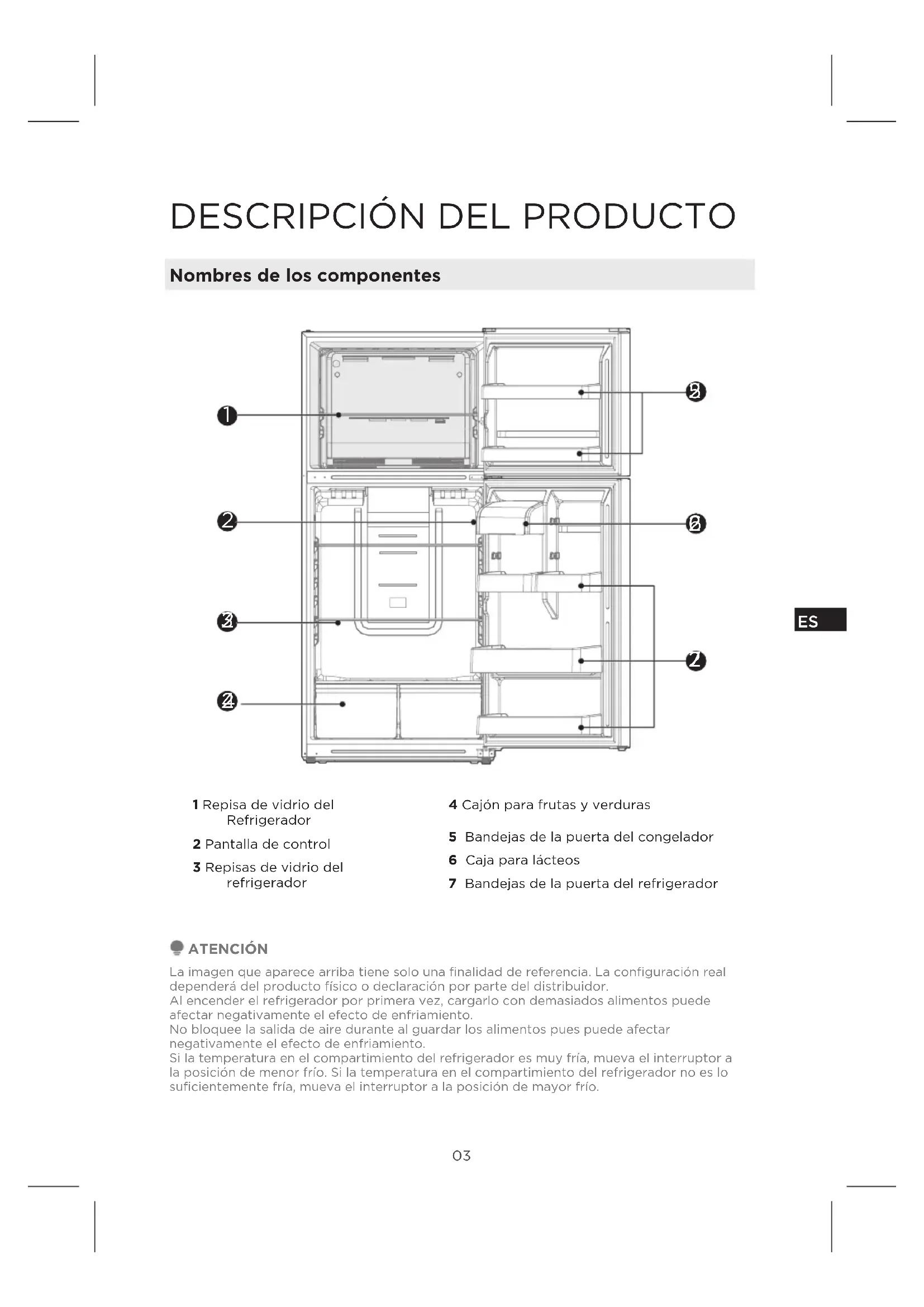 1 Repisa de vidrio del Refrigerador4 Cajón para frutas y verduras2 Pantalla de control3 Repisas de vidrio del refrigerador5 Bandejas de la puerta del congelador 6 Caja para lácteos7 Bandejas de la puerta del refrigerador ATENCIÓN La imagen que aparece arriba tiene solo una finalidad de referencia. La configuración real dependerá del producto físico o declaración por parte del distribuidor.Al encender el refrigerador por primera vez, cargarlo con demasiados alimentos puede afectar negativamente el efecto de enfriamiento.No bloquee la salida de aire durante al guardar los alimentos pues puede afectar negativamente el efecto de enfriamiento. Si la temperatura en el compartimiento del refrigerador es muy fría, mueva el interruptor a la posición de menor frío. Si la temperatura en el compartimiento del refrigerador no es lo suficientemente fría, mueva el interruptor a la posición de mayor frío.04