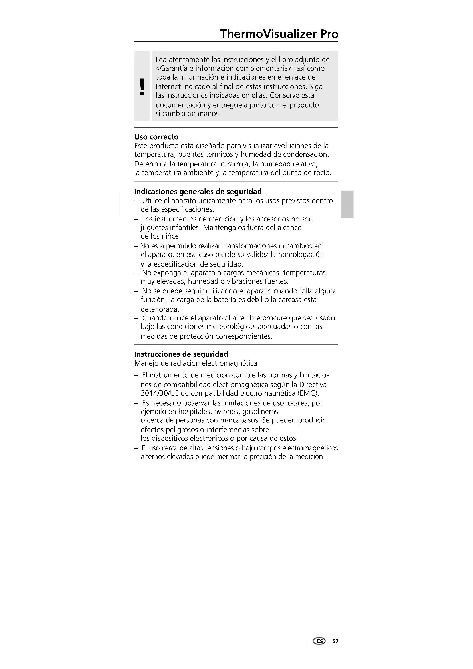 Indicaciones generales de seguridad – Utilice el aparato únicamente para los usos previstos dentro de las especicaciones. – Los instrumentos de medición y los accesorios no son juguetes infantiles. Manténgalos fuera del alcance de los niños. – No está permitido realizar transformaciones ni cambios en el aparato, en ese caso pierde su validez la homologación y la especicación de seguridad. – No exponga el aparato a cargas mecánicas, temperaturas muy elevadas, humedad o vibraciones fuertes. – No se puede seguir utilizando el aparato cuando falla alguna función, la carga de la batería es débil o la carcasa está deteriorada. – Cuando utilice el aparato al aire libre procure que sea usado bajo las condiciones meteorológicas adecuadas o con las medidas de protección correspondientes. Uso correcto Este producto está diseñado para visualizar evoluciones de la temperatura, puentes térmicos y humedad de condensación. Determina la temperatura infrarroja, la humedad relativa, la temperatura ambiente y la temperatura del punto de rocío. Lea atentamente las instrucciones y el libro adjunto de «Garantía e información complementaria», así como toda la información e indicaciones en el enlace de Internet indicado al final de estas instrucciones. Siga las instrucciones indicadas en ellas. Conserve esta documentación y entréguela junto con el producto si cambia de manos.