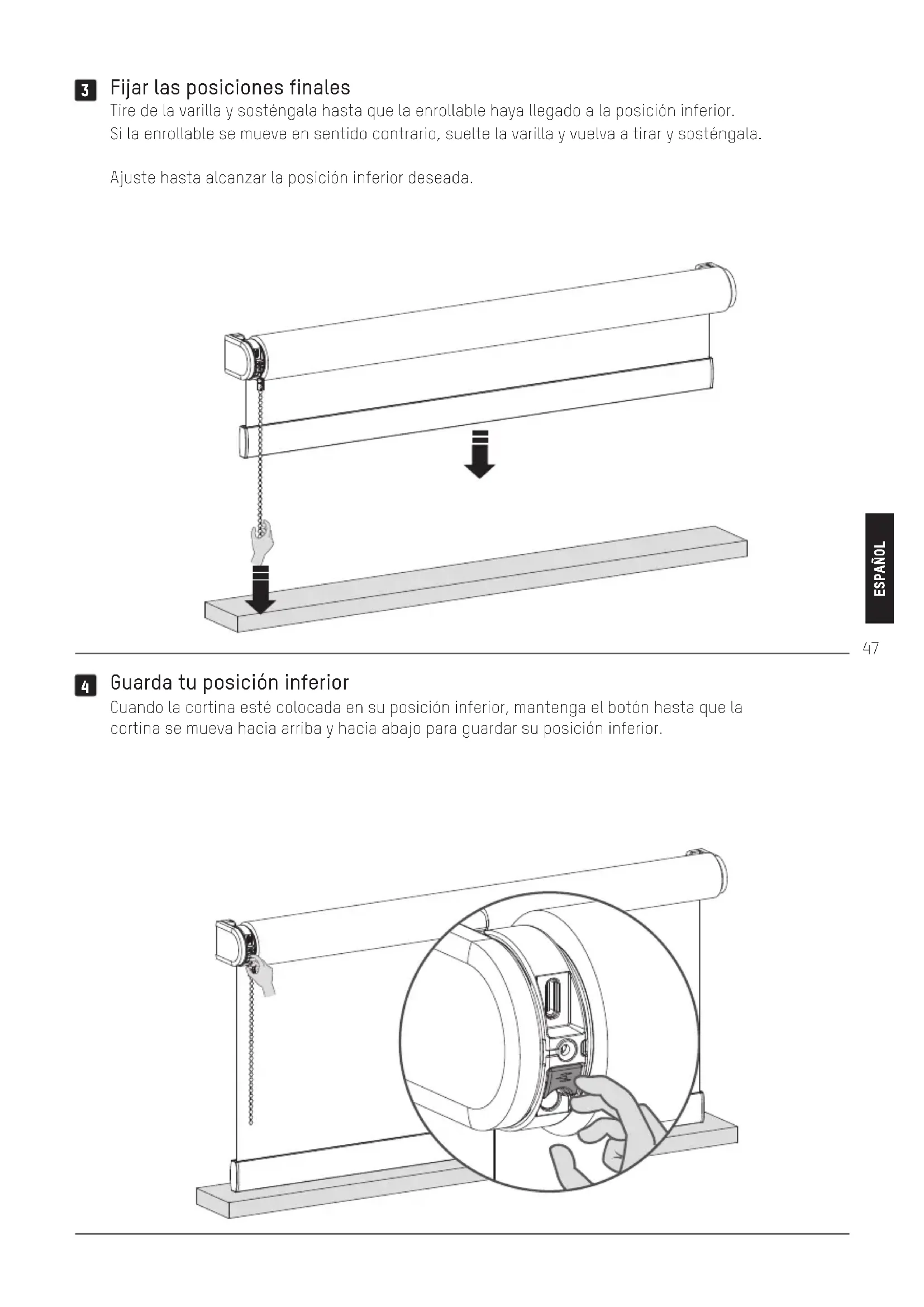 Cuando la cortina está colocada en su posición inferior, mantenga el botón hasta que la cortina se pueda hacer abriba y hacer abajo para guardar su posición inferior.
