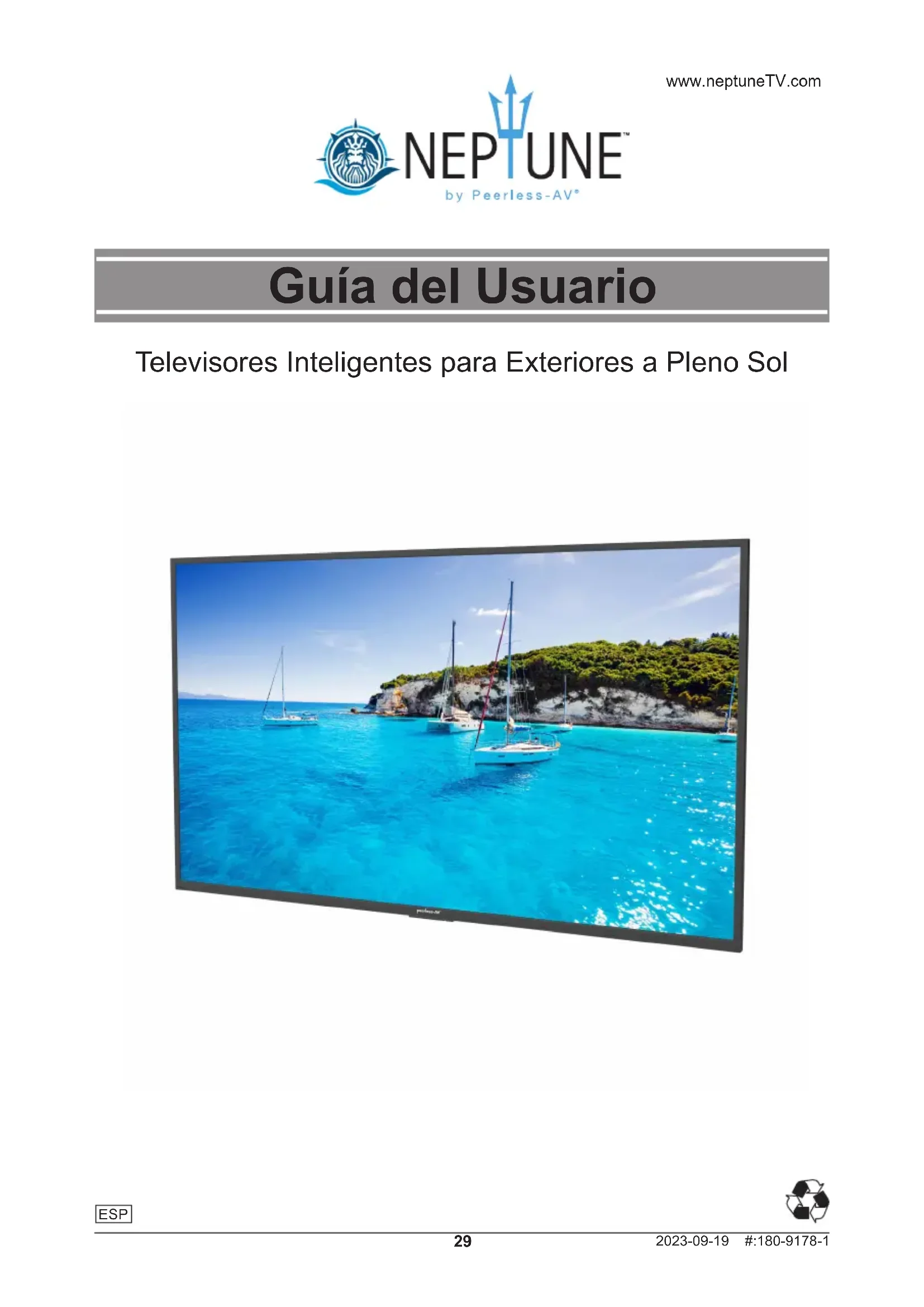 Android iOS55 2023-09-19 #:180-9178-1 Cuidado de la pantalla No frote ni golpee la pantalla con objetos duros, ya que puede rayar, marcar y hasta dañar la pantalla permanentemente. Asegúrese de que la pantalla esté instalada en un lugar seguro contra el contacto con abrasivos o escombros impulsados por el aire, los cuales podrían causarle daños a la pantalla LCD. Nunca utilice amoníaco ni productos que contengan amoníaco, ya que dañará la capa antirreectora de la pantalla. Utilice solamente productos aprobados para la limpieza de pantallas. Desenchufe el cable eléctrico antes de limpiar la pantalla. Quítele el polvo a la pantalla limpiando la pantalla y los paneles exteriores con un paño limpio y suave. Si necesita una limpieza más profunda, utilice un paño limpio y húmedo. No utilice limpiadores en aerosol ni solventes de tipo alguno. No utilice ningún químico, como solvente de pintura o benceno para limpiar el exterior del producto. Podría rayar las supercies, borrar indicaciones necesarias, etiquetas de identicación o instrucciones exteriores, lo cual puede causar el mal uso o funcionamiento del producto. Precaución sobre teléfonos móviles Mantenga su teléfono móvil lejos de la pantalla para evitar interferencia con la imagen o el sonido que puedan causarle daños permanentes a la pantalla. Fin del ciclo de vida útil En un esfuerzo por ofrecer productos ecológicos que no dañen el medioambiente, su nueva pantalla contiene materiales que se pueden reciclar y reusar. Cuando nalice el ciclo de vida útil de su pantalla, existen compañías especializadas que pueden minimizar los desperdicios de la pantalla separando los materiales reusables de los demás. Por favor, asegúrese de desechar su pantalla de acuerdo con las regulaciones locales. Esta computadora es un electrodoméstico. Tiene un aislamiento eléctrico de Clase II, o un doble aislamiento eléctrico, y ha sido diseñada de tal manera que no requiere una conexión de seguridad a la tierra. Si en algún momento usted necesita descartar este dispositivo, por favor, tenga presente que los productos eléctricos no se deben desechar junto con los desperdicios del hogar. Por favor, recíclelo en un lugar habilitado para ello. Consulte con las autoridades locales o con el vendedor para conocer las opciones de reciclaje (Instrucciones para los desperdicios eléctricos y los equipos electrónicos). MANTENIMIENTO56 2023-09-19 #:180-9178-1 Página en blanco. ESP57 2023-09-19 #:180-9178-1 Manuel de l’utilisateur www.neptuneTV.com