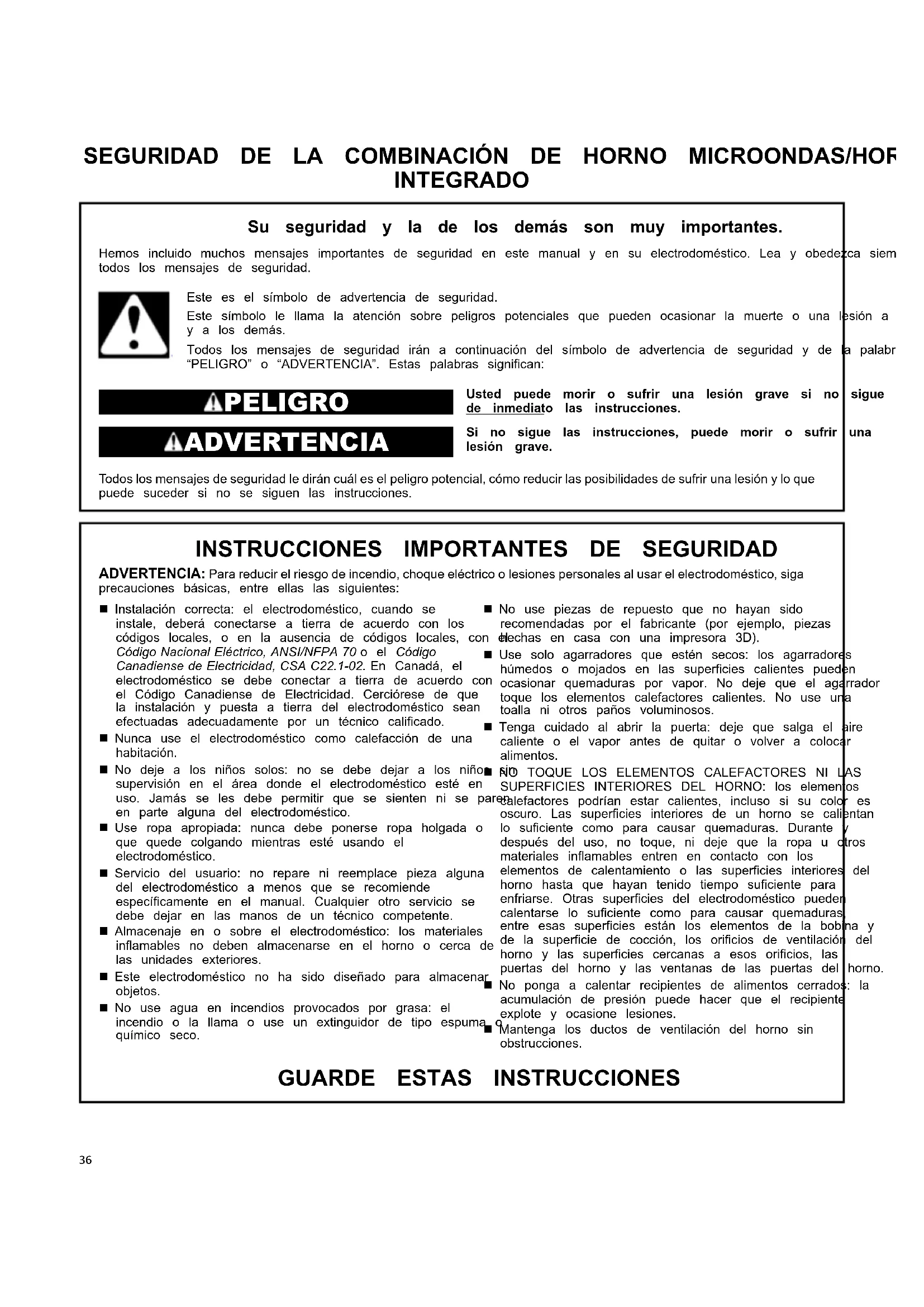 récipient. L’eau dans le contenant doit être chaude. Pour obtenir de l’assistance ou une visite de service : Consulter le guide de démarrage rapide pour obtenir les coordonnées ou communiquer avec le marchand chez qui le four et le four à micro-ondes ont été achetés.36 SEGURIDAD DE LA COMBINACIÓN DE HORNO MICROONDAS/HORNO INTEGRADO Su seguridad y la de los demás son muy importantes. Hemos incluido muchos mensajes importantes de seguridad en este manual y en su electrodoméstico. Lea y obedezca siempre todos los mensajes de seguridad. Este es el símbolo de advertencia de seguridad. Este símbolo le llama la atención sobre peligros potenciales que pueden ocasionar la muerte o una lesión a usted y a los demás. Todos los mensajes de seguridad irán a continuación del símbolo de advertencia de seguridad y de la palabra “PELIGRO” o “ADVERTENCIA”. Estas palabras significan: PELIGRO Usted puede morir o sufrir una lesión grave si no sigue de inmediato las instrucciones. ADVERTENCIA Si no sigue las instrucciones, puede morir o sufrir una lesión grave. Todos los mensajes de seguridad le dirán cuál es el peligro potencial, cómo reducir las posibilidades de sufrir una lesión y lo que puede suceder si no se siguen las instrucciones.