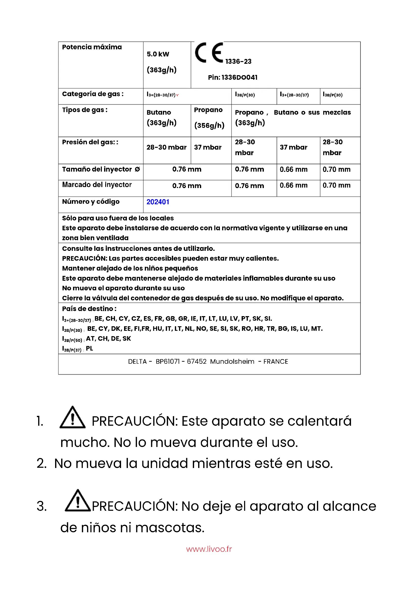 Sólo para uso fuera de los locales Este aparato debe instalarse de acuerdo con la normativa vigente y utilizarse en una zona bien ventilada Consulte las instrucciones antes de utilizarlo. PRECAUCIÓN: Las partes accesibles pueden estar muy calientes. Mantener alejado de los niños pequeños Este aparato debe mantenerse alejado de materiales inflamables durante su uso No mueva el aparato durante su uso Cierre la válvula del contenedor de gas después de su uso. No modifique el aparato. País de destino :