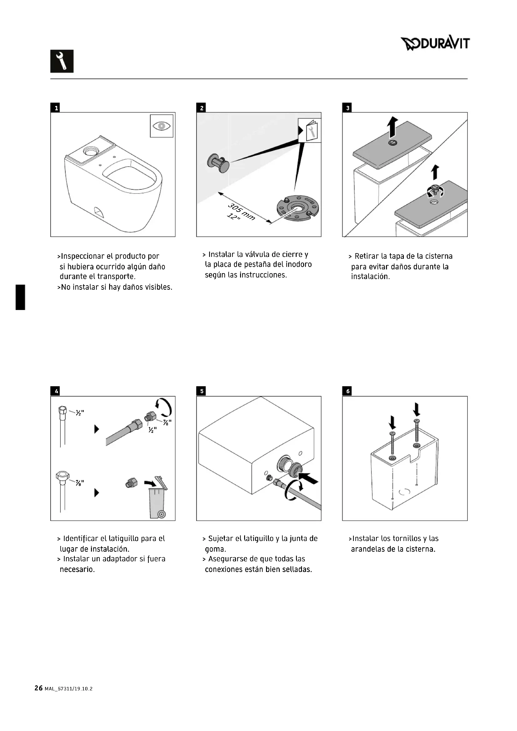 > Instalar los tornillos y las arandelas de la cisterna. > Inspeccionar el producto por si hubiera ocurrido algún daño durante el transporte. > No instalar si hay daños visibles. > Retirar la tapa de la cisterna para evitar daños durante la instalación. > Identificar el latiguillo para el lugar de instalación. > Instalar un adaptador si fuera necesario. > Instalar la válvula de cierre y la placa de pestaña del inodoro según las instrucciones. > Sujetar el latiguillo y la junta de goma. > Asegurarse de que todas las conexiones están bien selladas. 26 MAL_57311/19.10.2