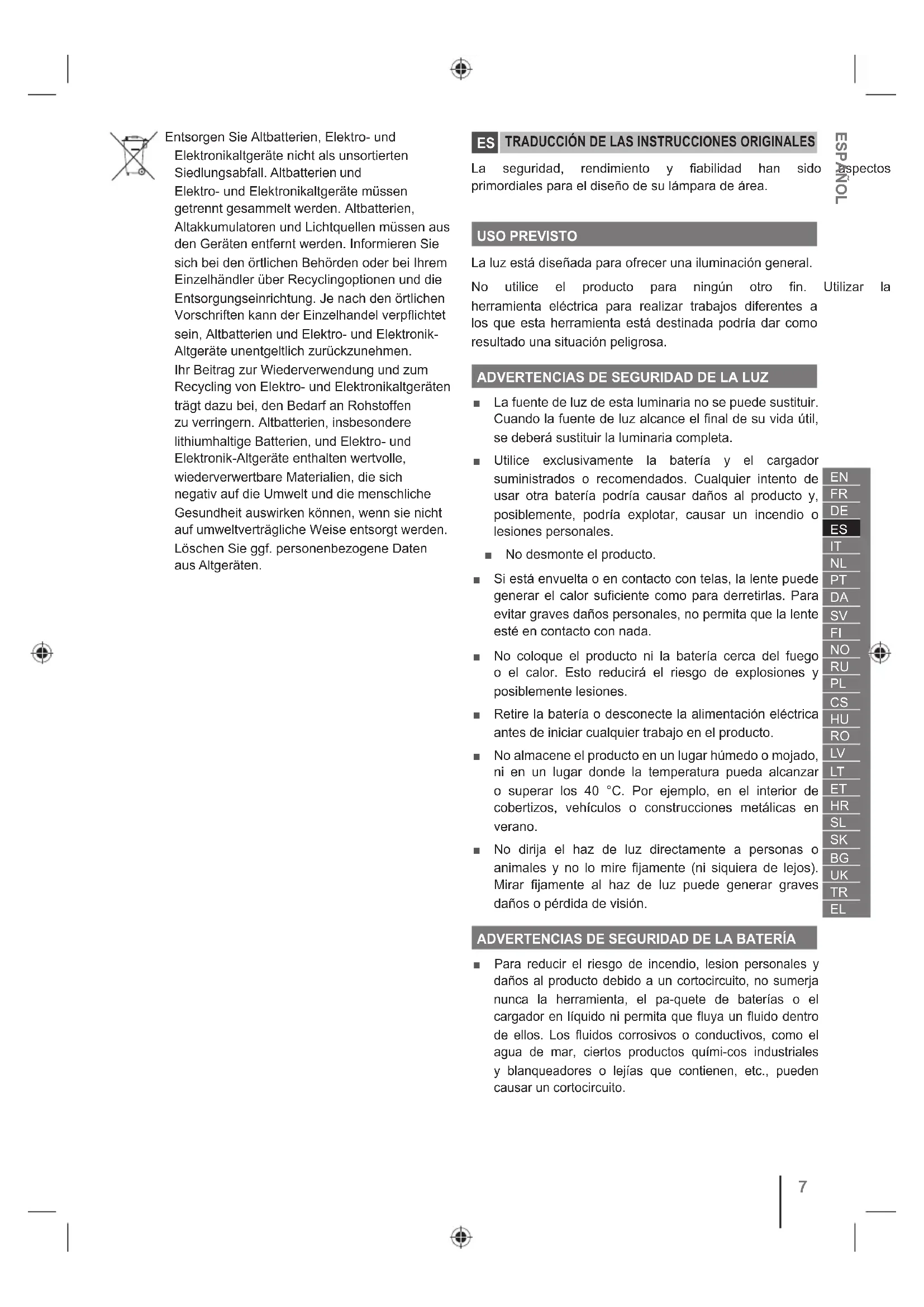 Ŷ La fuente de luz de esta luminaria no se puede sustituir. Cuando la fuente de luz alcance el final de su vida útil, se deberá sustituir la luminaria completa. Ŷ Utilice exclusivamente la batería y el cargador suministrados o recomendados. Cualquier intento de usar otra batería podría causar daños al producto y, posiblemente, podría explotar, causar un incendio o lesiones personales. Ŷ No desmonte el producto. Ŷ Si está envuelta o en contacto con telas, la lente puede generar el calor suficiente como para derretirlas. Para evitar graves daños personales, no permita que la lente esté en contacto con nada. Ŷ No coloque el producto ni la batería cerca del fuego o el calor. Esto reducirá el riesgo de explosiones y posiblemente lesiones. Ŷ Retire la batería o desconecte la alimentación eléctrica antes de iniciar cualquier trabajo en el producto. Ŷ No almacene el producto en un lugar húmedo o mojado, ni en un lugar donde la temperatura pueda alcanzar o superar los 40 °C. Por ejemplo, en el interior de cobertizos, vehículos o construcciones metálicas en verano. Ŷ No dirija el haz de luz directamente a personas o animales y no lo mire fijamente (ni siquiera de lejos). Mirar fijamente al haz de luz puede generar graves daños o pérdida de visión. ADVERTENCIAS DE SEGURIDAD DE LA BATERÍA Ŷ Para reducir el riesgo de incendio, lesion personales y daños al producto debido a un cortocircuito, no sumerja nunca la herramienta, el pa-quete de baterías o el cargador en líquido ni permita que fluya un fluido dentro de ellos. Los fluidos corrosivos o conductivos, como el agua de mar, ciertos productos quími-cos industriales y blanqueadores o lejías que contienen, etc., pueden causar un cortocircuito. ESPAÑOL