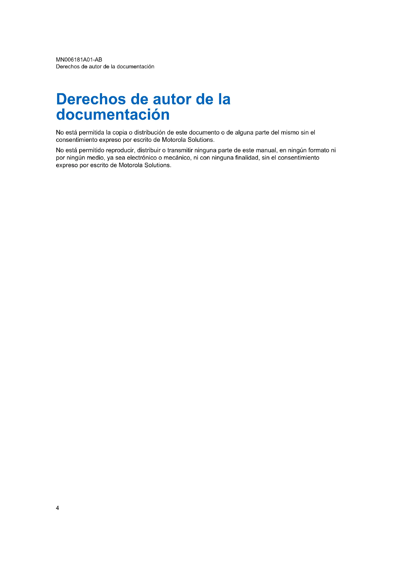 Capítulo 11: Accesorios.......................................................................................... 49 MN006181A01-AB Contenido 3Derechos de autor de la documentación No está permitida la copia o distribución de este documento o de alguna parte del mismo sin el consentimiento expreso por escrito de Motorola Solutions. No está permitido reproducir, distribuir o transmitir ninguna parte de este manual, en ningún formato ni por ningún medio, ya sea electrónico o mecánico, ni con ninguna finalidad, sin el consentimiento expreso por escrito de Motorola Solutions. MN006181A01-AB Derechos de autor de la documentación 4Descargo de responsabilidad La información de este documento se ha analizado exhaustivamente y se considera totalmente fiable. No obstante, no se asume ninguna responsabilidad por las posibles imprecisiones. De hecho, Motorola Solutions se reserva el derecho de realizar cambios en cualquier producto aquí descrito para mejorar su legibilidad, función o diseño. Motorola Solutions no asumirá ninguna responsabilidad derivada de las aplicaciones o del uso de cualquier producto o circuito descritos en el presente documento, ni cubrirá ninguna licencia en virtud de sus derechos de patente ni de los derechos de terceros. MN006181A01-AB Descargo de responsabilidad 5Derechos de autor del software informático Los productos de Motorola Solutions descritos en el presente manual pueden incluir programas informáticos de Motorola Solutions protegidos por derechos de copyright almacenados en memorias de semiconductores o en otro tipo de medios. Las leyes de los Estados Unidos y de otros países preservan ciertos derechos exclusivos de Motorola Solutions con respecto a los programas informáticos protegidos por derechos de autor, que incluyen, entre otros, el derecho exclusivo de copia o reproducción en cualquier formato de un programa informático protegido por derechos de autor. Por consiguiente, se prohíbe la copia, la reproducción, la modificación, el uso de técnicas de ingeniería inversa y la distribución de forma alguna de todo programa informático de Motorola Solutions protegido por copyright e incluido en los productos de Motorola Solutions descritos en el presente manual sin el consentimiento expreso por escrito de Motorola Solutions. Asimismo, la adquisición de los productos de Motorola Solutions no garantiza, de forma implícita ni explícita, por impedimento legal ni de ningún otro modo, ningún tipo de licencia en lo que respecta a los derechos de copyright, las patentes o las solicitudes de patentes de Motorola Solutions, excepto en los casos de uso de licencias normales y no excluyentes derivados de la ejecución de la ley en la venta de un producto. MN006181A01-AB Derechos de autor del software informático 6Información de seguridad sobre baterías, cargadores y accesorios de audio Este documento contiene instrucciones importantes sobre uso y seguridad. Lea estas instrucciones atentamente y guárdelas para poder consultarlas en el futuro. Antes de utilizar el cargador de batería, lea todas las instrucciones y señales de precaución que aparecen en: