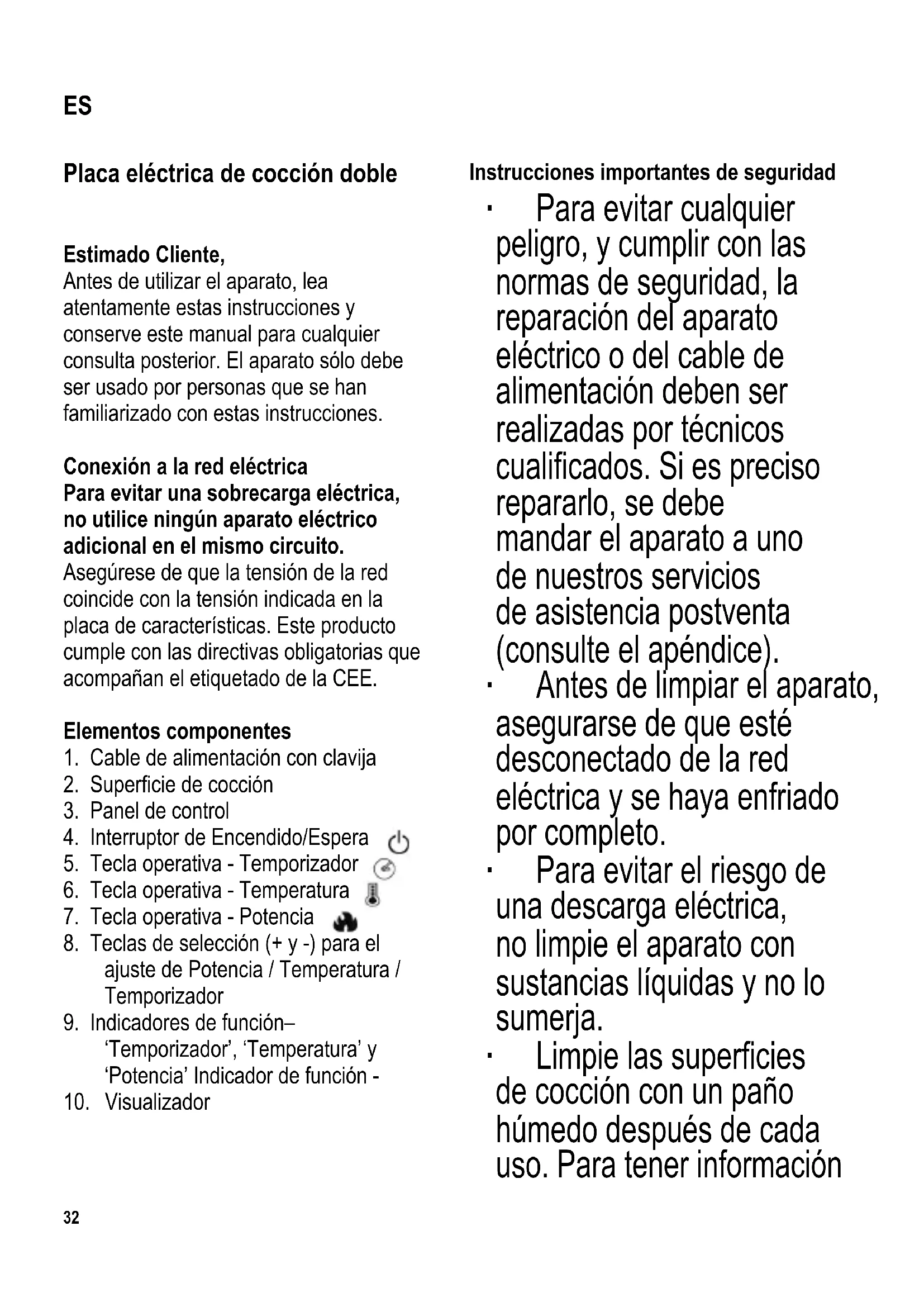 Instrucciones importantes de seguridad ∙ Para evitar cualquier peligro, y cumplir con las normas de seguridad, la reparación del aparato eléctrico o del cable de alimentación deben ser realizadas por técnicos cualicados. Si es preciso repararlo, se debe mandar el aparato a uno de nuestros servicios de asistencia postventa (consulte el apéndice). ∙ Antes de limpiar el aparato, asegurarse de que esté desconectado de la red eléctrica y se haya enfriado por completo. ∙ Para evitar el riesgo de una descarga eléctrica, no limpie el aparato con sustancias líquidas y no lo sumerja. ∙ Limpie las supercies de cocción con un paño húmedo después de cada uso. Para tener información ES104 x 142 mm