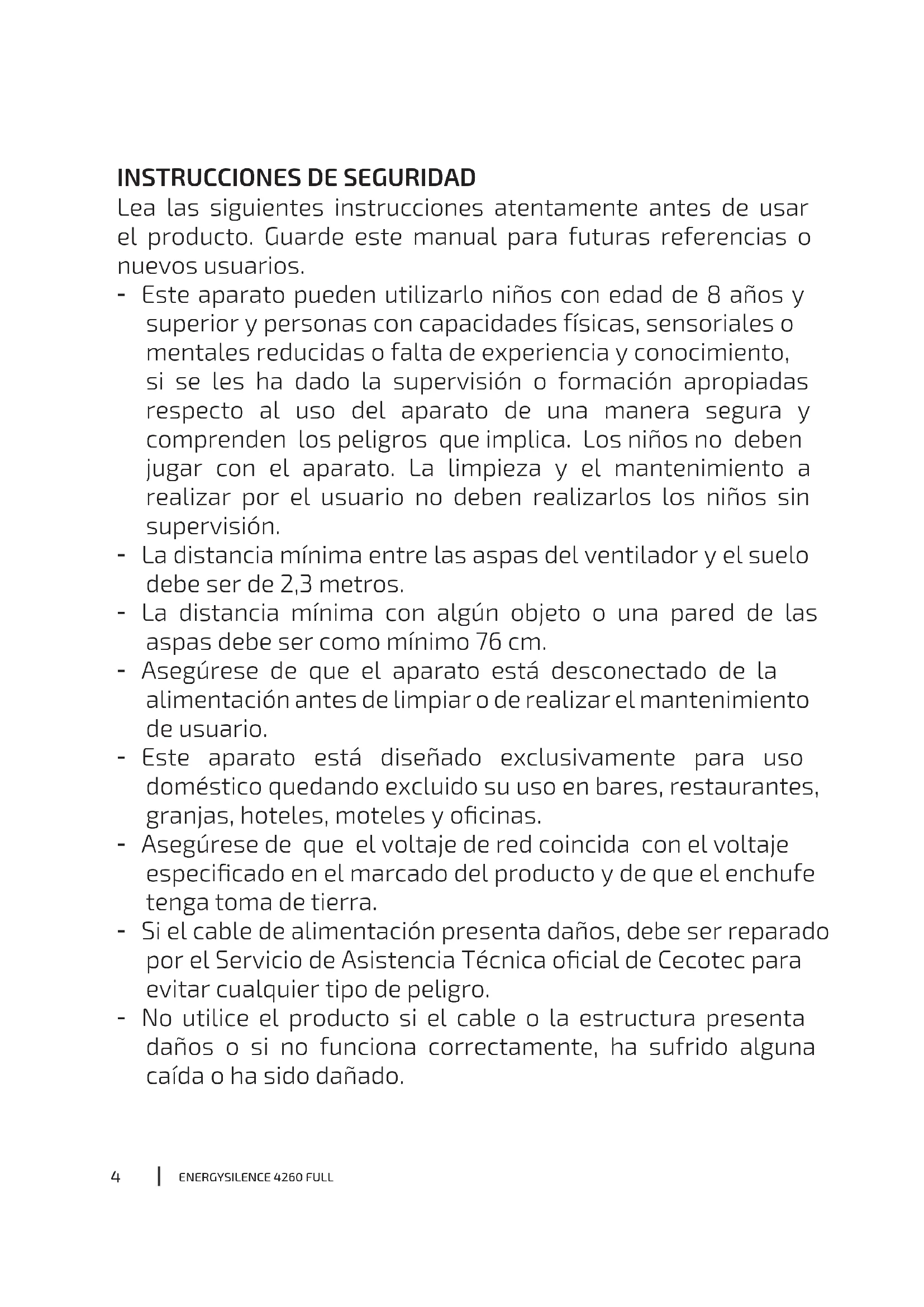 Lea las siguientes instrucciones atentamente antes de usar el producto. Guarde este manual para futuras referencias o nuevos usuarios. - Este aparato pueden utilizarlo niños con edad de 8 años y superior y personas con capacidades físicas, sensoriales o mentales reducidas o falta de experiencia y conocimiento, si se les ha dado la supervisión o formación apropiadas respecto al uso del aparato de una manera segura y comprenden los peligros que implica. Los niños no deben jugar con el aparato. La limpieza y el mantenimiento a realizar por el usuario no deben realizarlos los niños sin supervisión. - La distancia mínima entre las aspas del ventilador y el suelo debe ser de 2,3 metros. - La distancia mínima con algún objeto o una pared de las aspas debe ser como mínimo 76 cm. - Asegúrese de que el aparato está desconectado de la alimentación antes de limpiar o de realizar el mantenimiento de usuario. - Este aparato está diseñado exclusivamente para uso doméstico quedando excluido su uso en bares, restaurantes, granjas, hoteles, moteles y ocinas. - Asegúrese de que el voltaje de red coincida con el voltaje especicado en el marcado del producto y de que el enchufe tenga toma de tierra. - Si el cable de alimentación presenta daños, debe ser reparado por el Servicio de Asistencia Técnica ocial de Cecotec para evitar cualquier tipo de peligro. - No utilice el producto si el cable o la estructura presenta daños o si no funciona correctamente, ha sufrido alguna caída o ha sido dañado.ENERGYSILENCE 4260 FULL