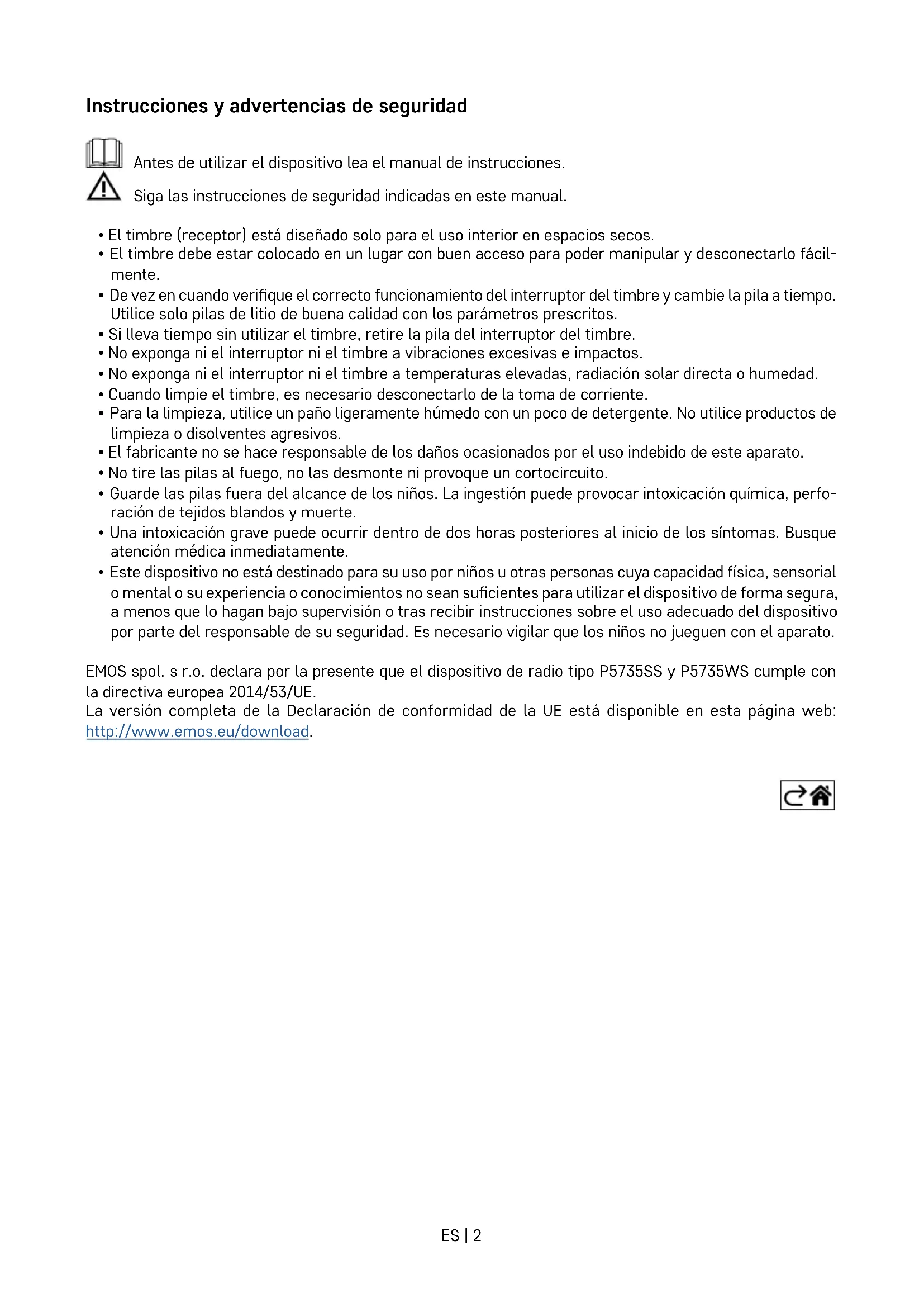 - Este dispositivo no está destinado para su uso por niños u otras personas cuya capacidad física, sensorial o mental o su experiencia o conocimientos no sean sucientes para utilizar el dispositivo de forma segura, a menos que lo hagan bajo supervisión o tras recibir instrucciones sobre el uso adecuado del dispositivo por parte del responsable de su seguridad. Es necesario vigilar que los niños no jueguen con el aparato. EMOS spol. sr.o. declara por la presente que el dispositivo de radio tipo P5735SS y P5735WS cumple con la directiva europea 2014/53/UE. La versión completa de la Declaración de conformidad de la UE está disponible en esta página web: http://www.emos.eu/download.ES | 3 80 mm 38 mm 19 mm 65 mm 80 mm 92 mm Especicaciones técnicas Alcance de la emisión: hasta 150 m en espacio libre (en espacios edicados puede disminuir hasta una quinta parte) Interruptor: resistente al agua; protección IP44 Vinculación del timbre con los interruptores: función „self-learning“ Capacidad de vinculación: máximo 8 interrup- tores por 1 timbre, máximo 2 interruptores por 1 timbre en la aplicación EMOS GoSmart Número de tonos: 52 Frecuencia de transmisión: 433,92 MHz, 10 mW PRA máx. Alimentación del timbre: 230V AC/50Hz Alimentación del interruptor: 1 pila de 3 V (tipo CR2032, incluida en el paquete) Incluido en la entrega: cinta de doble caraES | 4