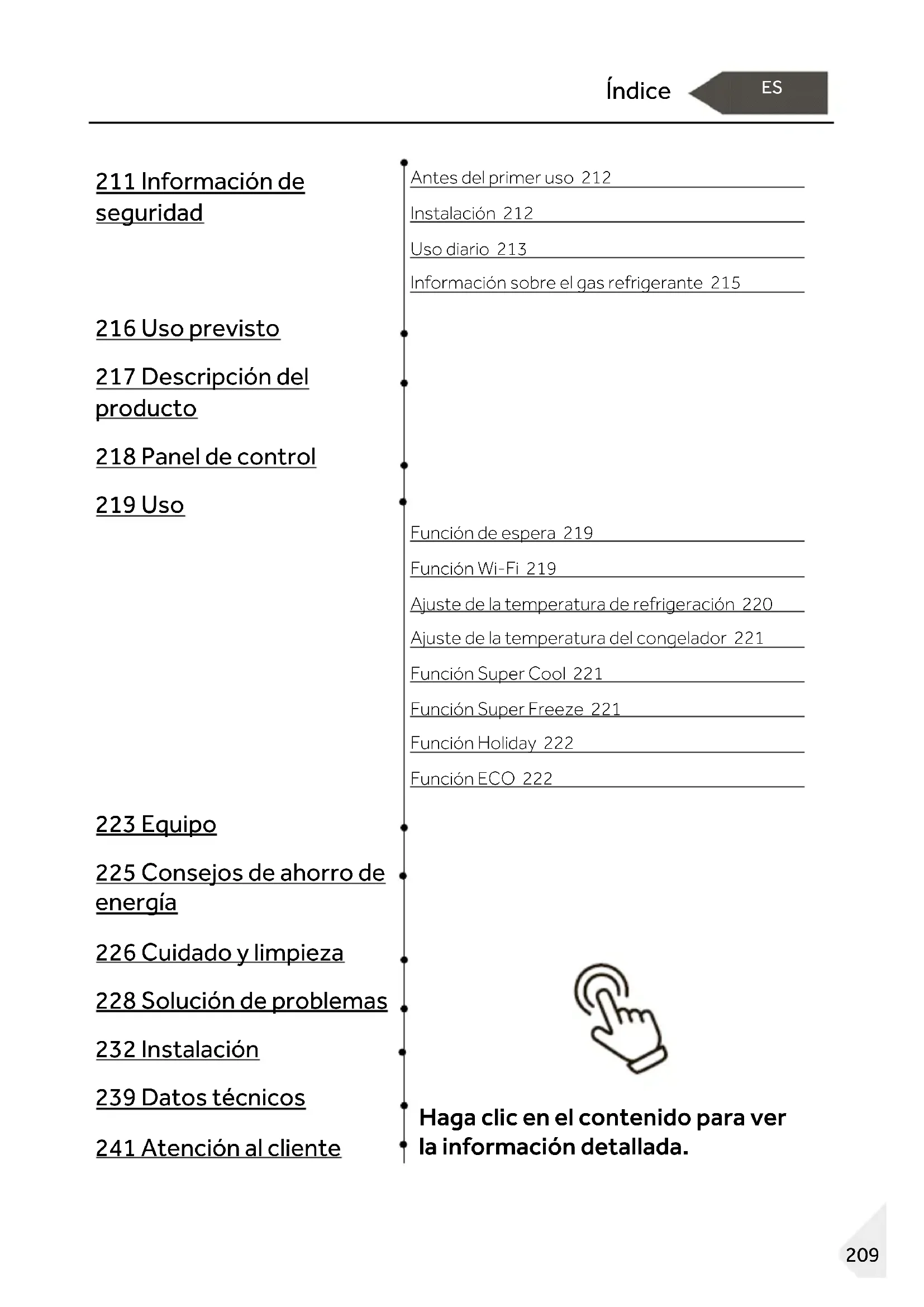 225 Consejos de ahorro de energía 226 Cuidado y limpieza 228 Solución de problemas 232 Instalación 239 Datos técnicos Haga clic en el contenido para ver la información detallada. 241 Atención al clienteGracias