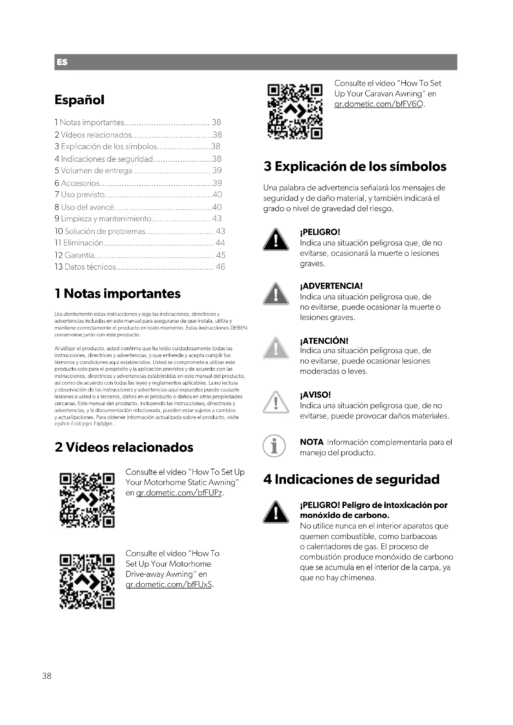 - un motif de réclamation ou une description du dysfonctionnement Notez que toute réparation effectuée par une personne non agréée peut présenter un risque de sécurité et annuler la garantie. La garantie couvre les défauts de fabrication, les matériaux et les pièces. La garantie ne couvre pas la décoloration de la couverture et l’usure et les déchirures dues aux rayons UV, à une mauvaise utilisation, des dommages accidentels, des dommages dus aux tempêtes ou une utilisation permanente, semi- permanente ou commerciale. Elle ne couvre pas les dommages qui en résultent. Veuillez contacter votre revendeur pour toute réclamation. Ceci n’affecte pas vos droits statutaires. 36FR 13 Caractéristiques techniques Largeur (mm) Profondeur (mm) Poids(kg) Poids min. (kg) Grande AIR Tour 390 S 390 300 24.5 /7.24 18.1 Grande AIR Tour 390 M 390 300 25.1 / 7.2 18.6 Rally AIR Tour 200 S 200 250 19 10.3 Rally AIR Tour 260 S 260 250 24.2 13.1 Rally AIR Tour 260 M 260 250 24.7 13.7 Rally AIR Tour 330 S 330 250 26 14.1 Rally AIR Tour 330 M 330 250 26.5 14.7 Rally AIR Tour 390 S 390 250 27.6 15.2 Rally AIR Tour 390 M 390 250 28.1 15.2 Rally AIR Tour 260 DA 260 250 25.1 / 7.2 15 Rally AIR Tour 330 DA 330 250 26.5 / 8.2 20.7 Rally AIR Tour 390 DA 390 250 27.1 / 9.1 24 Leggera AIR 220 S 220 240 8.7 7.4 Leggera AIR 260 S 260 240 12.2 8.4 Leggera AIR 260 M 260 240 12.6 9 37ES Español 1 Notas importantes................................... 38 2 Vídeos relacionados.................................38 3 Explicación de los símbolos......................38 4 Indicaciones de seguridad........................38 5 Volumen de entrega................................ 39 6 Accesorios..............................................39 7 Uso previsto............................................40 8 Uso del avancé........................................40 9 Limpieza y mantenimiento........................ 43 10 Solución de problemas............................ 43 11 Eliminación............................................. 44 12 Garantía................................................. 45 13 Datos técnicos........................................ 46 1 Notas importantes Lea atentamente estas instrucciones y siga las indicaciones, directrices y advertencias incluidas en este manual para asegurarse de que instala, utiliza y mantiene correctamente el producto en todo momento. Estas instrucciones DEBEN conservarse junto con este producto. Al utilizar el producto, usted confirma que ha leído cuidadosamente todas las instrucciones, directrices y advertencias, y que entiende y acepta cumplir los términos y condiciones aquí establecidos. Usted se compromete a utilizar este producto solo para el propósito y la aplicación previstos y de acuerdo con las instrucciones, directrices y advertencias establecidas en este manual del producto, así como de acuerdo con todas las leyes y reglamentos aplicables. La no lectura y observación de las instrucciones y advertencias aquí expuestas puede causarle lesiones a usted o a terceros, daños en el producto o daños en otras propiedades cercanas. Este manual del producto, incluyendo las instrucciones, directrices y advertencias, y la documentación relacionada, pueden estar sujetos a cambios y actualizaciones. Para obtener información actualizada sobre el producto, visite documents.dometic.com. 2 Vídeos relacionados Consulte el vídeo “How To Set Up Your Motorhome Static Awning” en qr.dometic.com/bfFUPz. Consulte el vídeo “How To Set Up Your Motorhome Drive-away Awning” en qr.dometic.com/bfFUxS. Consulte el vídeo “How To Set Up Your Caravan Awning” en qr.dometic.com/bfFV6O. 3 Explicación de los símbolos Una palabra de advertencia señalará los mensajes de seguridad y de daño material, y también indicará el grado o nivel de gravedad del riesgo. ¡PELIGRO! Indica una situación peligrosa que, de no evitarse, ocasionará la muerte o lesiones graves. ¡ADVERTENCIA! Indica una situación peligrosa que, de no evitarse, puede ocasionar la muerte o lesiones graves. ¡ATENCIÓN! Indica una situación peligrosa que, de no evitarse, puede ocasionar lesiones moderadas o leves. ¡AVISO! Indica una situación peligrosa que, de no evitarse, puede provocar daños materiales. NOTA Información complementaria para el manejo del producto. 4 Indicaciones de seguridad ¡PELIGRO! Peligro de intoxicación por monóxido de carbono. No utilice nunca en el interior aparatos que quemen combustible, como barbacoas o calentadores de gas. El proceso de combustión produce monóxido de carbono que se acumula en el interior de la carpa, ya que no hay chimenea. 38ES ¡ADVERTENCIA! Peligro de incendio