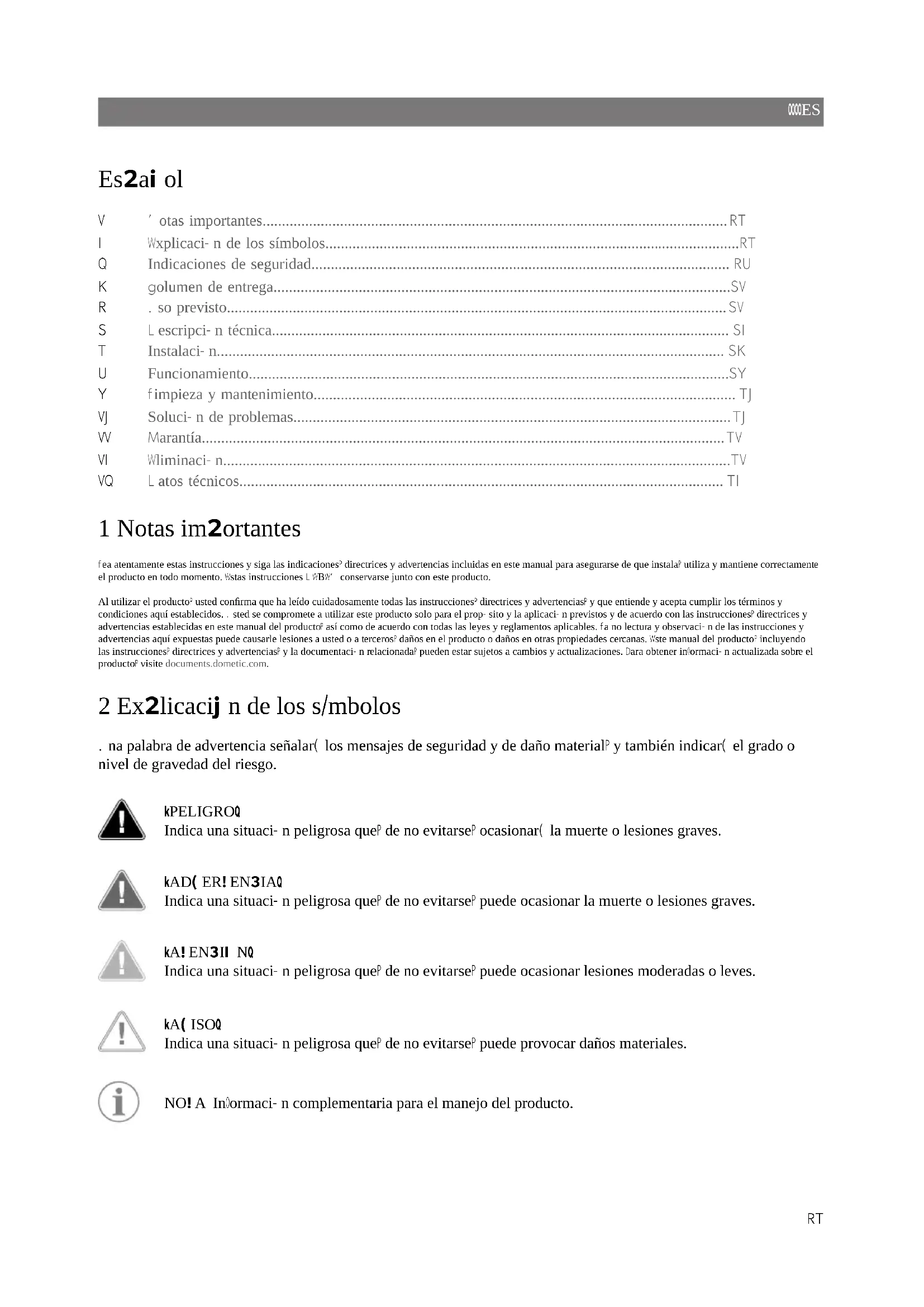 - 13 Datos técnicos 1 Notas importantes Lea atentamente estas instrucciones y siga las indicaciones, directrices y advertencias incluidas en este manual para asegurarse de que instala, utiliza y mantiene correctamente el producto en todo momento. Estas instrucciones DEBEN conservarse junto con este producto. Al utilizar el producto, usted confirma que ha leído cuidadosamente todas las instrucciones, directrices y advertencias, y que entiende y acepta cumplir los términos y condiciones aquí establecidos. Usted se compromete a utilizar este producto solo para el propósito y la aplicación previstos y de acuerdo con las instrucciones, directrices y advertencias establecidas en este manual del producto, así como de acuerdo con todas las leyes y reglamentos aplicables. La no lectura y observación de las instrucciones y advertencias aquí expuestas puede causarle lesiones a usted o a terceros, daños en el producto o daños en otras propiedades cercanas. Este manual del producto, incluyendo las instrucciones, directrices y advertencias, y la documentación relacionada, pueden estar sujetos a cambios y actualizaciones. Para obtener información actualizada sobre el producto, visite documents.dometic.com. 2 Explicación de los símbolos Una palabra de advertencia señalará los mensajes de seguridad y de daño material, y también indicará el grado o nivel de gravedad del riesgo. ¡PELIGRO! Indica una situación peligrosa que, de no evitarse, ocasionará la muerte o lesiones graves. ¡ADVERTENCIA! Indica una situación peligrosa que, de no evitarse, puede ocasionar la muerte o lesiones graves. ¡ATENCIÓN! Indica una situación peligrosa que, de no evitarse, puede ocasionar lesiones moderadas o leves. ¡AVISO! Indica una situación peligrosa que, de no evitarse, puede provocar daños materiales. NOTA Información complementaria para el manejo del producto. 57ES 3 Indicaciones de seguridad Tenga en cuenta las indicaciones de seguridad y las condiciones estipuladas por el fabricante del vehículo y los talleres autorizados. p. 72