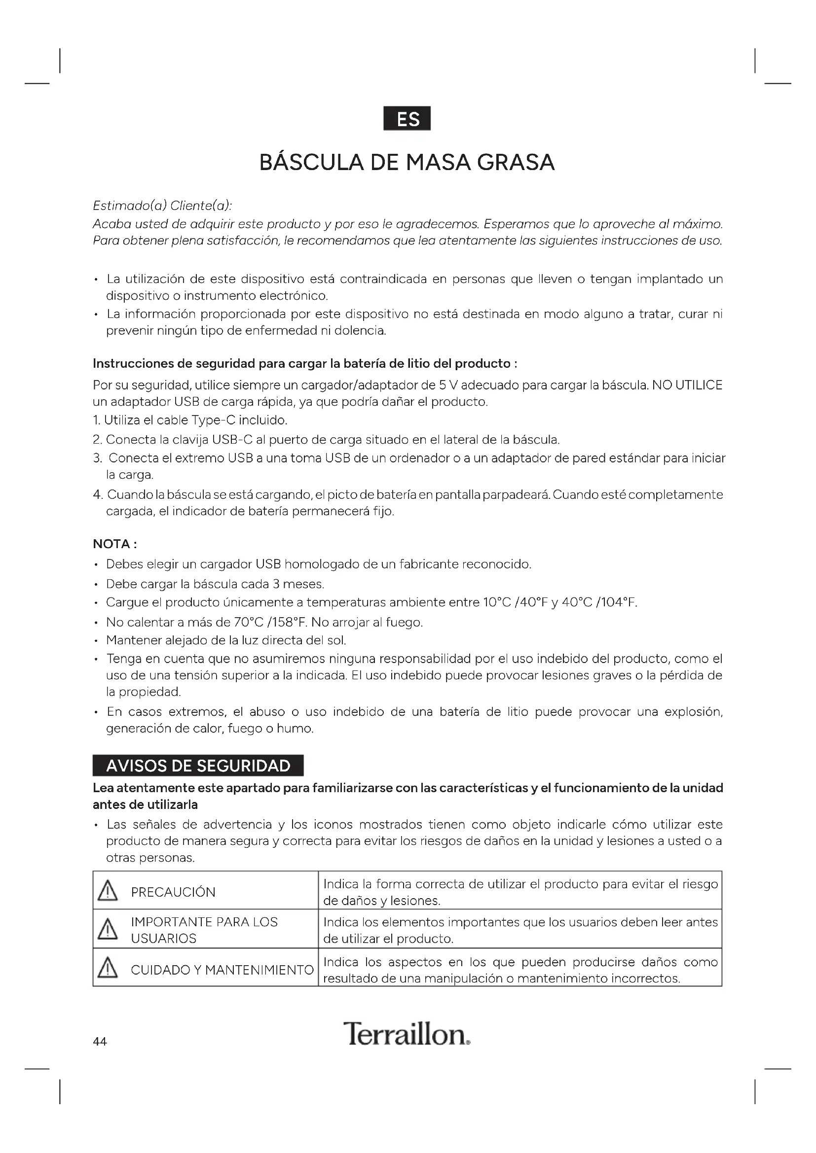 Si tiene alguna dificultad o necesita más información, puede encontrar nuestro centro de ayuda escaneando el código QR de al lado con su smartphone Si no encuentra la respuesta a su pregunta, también puede ponerse en contacto con nuestro Servicio Posventa: supportes@terrailloncom Una vez finalizada la carga, desenchufe el cargador No se recomienda dejar el producto cargando durante demasiado tiempo, ya que podría dañar la batería Edad Altura Hombre/Mujer Masa muscular % PesoMasa ósea kg Masa hídrica % Masa grasa % Bajo peso Modo Atleta Peso normal Índice de masa corporal Sobrepeso Nivel de batería Obesidad