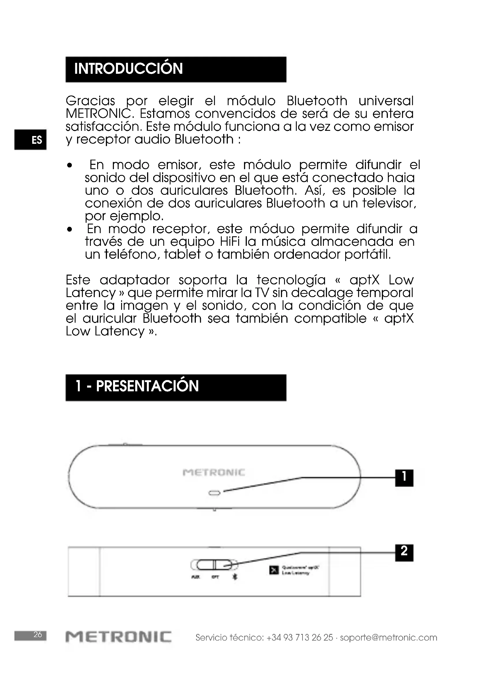- Alimentación : 5V=500mA (micro USB) 100, rue Gilles de Gennes 37310 TAUXIGNY FRANCE www.metronic.com Produit fabriqué hors UE Pol. Ind. Can Vinyalets C/ Can Vinyalets, 6 08130 Sta. Perpètua de la Mogoda (Barcelona) Qualcomm es una marca comercial de Qualcomm Incorporated, depositada en los Estados Unidos y otros países, utilizada con autorización. aptX es una marca comercial de Qualcomm Technologies International, Ltd., depositada en los Estados Unidos y otros países, utilizada con autorización.PT