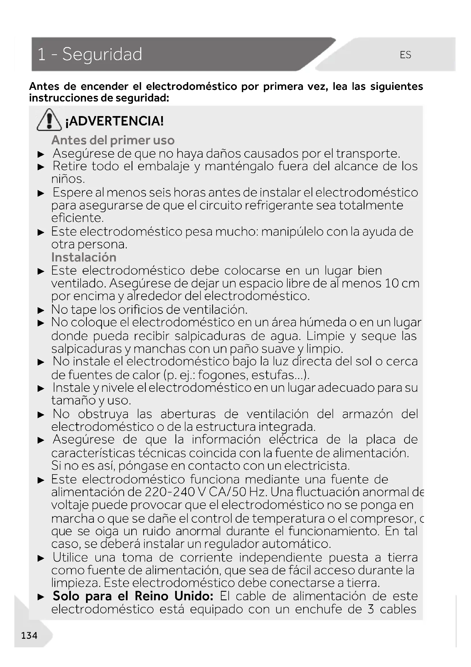 Antes de encender el electrodoméstico por primera vez, lea las siguientes instrucciones de seguridad: ¡ADVERTENCIA! Antes del primer uso ► Asegúrese de que no haya daños causados por el transporte. ► Retire todo el embalaje y manténgalo fuera del alcance de los niños. ► Espere al menos seis horas antes de instalar el electrodoméstico para asegurarse de que el circuito refrigerante sea totalmente eficiente. ► Este electrodoméstico pesa mucho: manipúlelo con la ayuda de otra persona. Instalación ► Este electrodoméstico debe colocarse en un lugar bien ventilado. Asegúrese de dejar un espacio libre de al menos 10 cm por encima y alrededor del electrodoméstico. ► No tape los orificios de ventilación. ► No coloque el electrodoméstico en un área húmeda o en un lugar donde pueda recibir salpicaduras de agua. Limpie y seque las salpicaduras y manchas con un paño suave y limpio. ► No instale el electrodoméstico bajo la luz directa del sol o cerca de fuentes de calor (p. ej.: fogones, estufas...). ► Instale y nivele el electrodoméstico en un lugar adecuado para su tamaño y uso. ► No obstruya las aberturas de ventilación del armazón del electrodoméstico o de la estructura integrada. ► Asegúrese de que la información eléctrica de la placa de características técnicas coincida con la fuente de alimentación. Si no es así, póngase en contacto con un electricista. ► Este electrodoméstico funciona mediante una fuente de alimentación de 220-240 V CA/50 Hz. Una fluctuación anormal del voltaje puede provocar que el electrodoméstico no se ponga en marcha o que se dañe el control de temperatura o el compresor, o que se oiga un ruido anormal durante el funcionamiento. En tal caso, se deberá instalar un regulador automático. ► Utilice una toma de corriente independiente puesta a tierra como fuente de alimentación, que sea de fácil acceso durante la limpieza. Este electrodoméstico debe conectarse a tierra. ► Solo para el Reino Unido: El cable de alimentación de este electrodoméstico está equipado con un enchufe de 3 cablesES