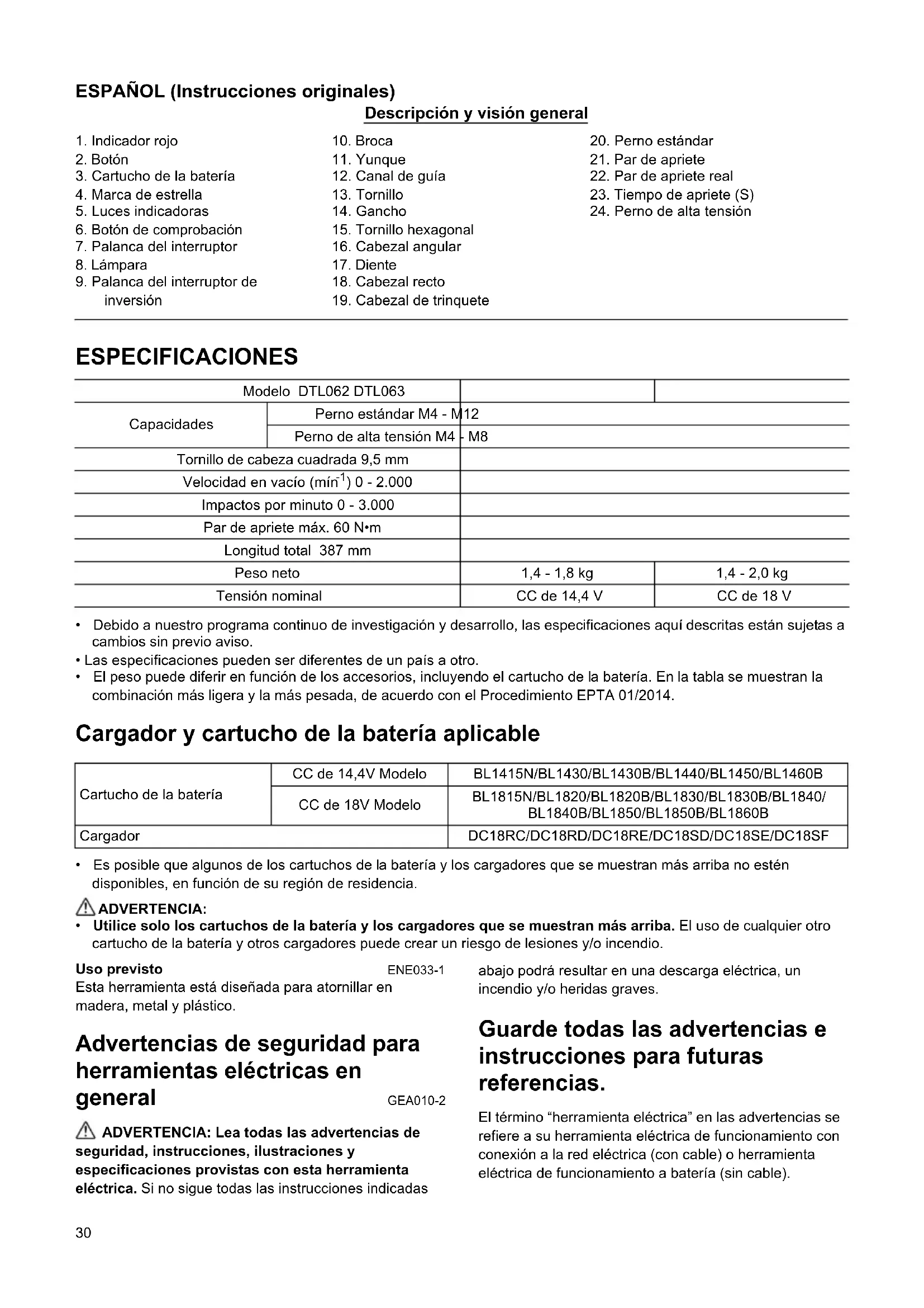 - Utilice solo los cartuchos de la batería y los cargadores que se muestran más arriba. El uso de cualquier otro cartucho de la batería y otros cargadores puede crear un riesgo de lesiones y/o incendio. Uso previsto ENE033-1 Esta herramienta está diseñada para atornillar en madera, metal y plástico. Advertencias de seguridad para herramientas eléctricas en general GEA010-2 ADVERTENCIA: Lea todas las advertencias de seguridad, instrucciones, ilustraciones y especificaciones provistas con esta herramienta eléctrica. Si no sigue todas las instrucciones indicadas abajo podrá resultar en una descarga eléctrica, un incendio y/o heridas graves. Guarde todas las advertencias e instrucciones para futuras referencias. El término “herramienta eléctrica” en las advertencias se refiere a su herramienta eléctrica de funcionamiento con conexión a la red eléctrica (con cable) o herramienta eléctrica de funcionamiento a batería (sin cable).