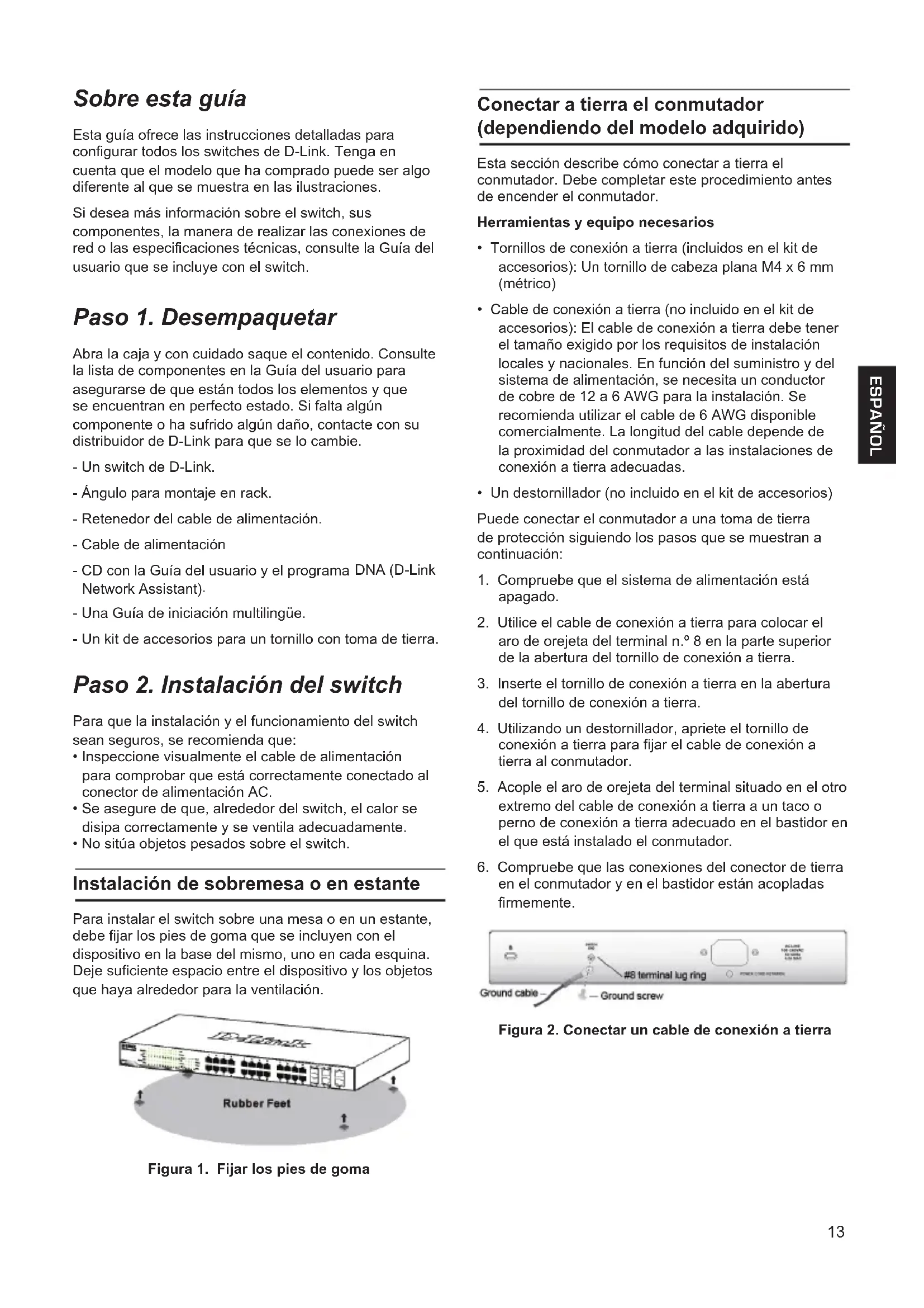- Una Guía de iniciación multilingüe. - Un kit de accesorios para un tornillo con toma de tierra. Paso 2. Instalación del switch Para que la instalación y el funcionamiento del switch sean seguros, se recomienda que: