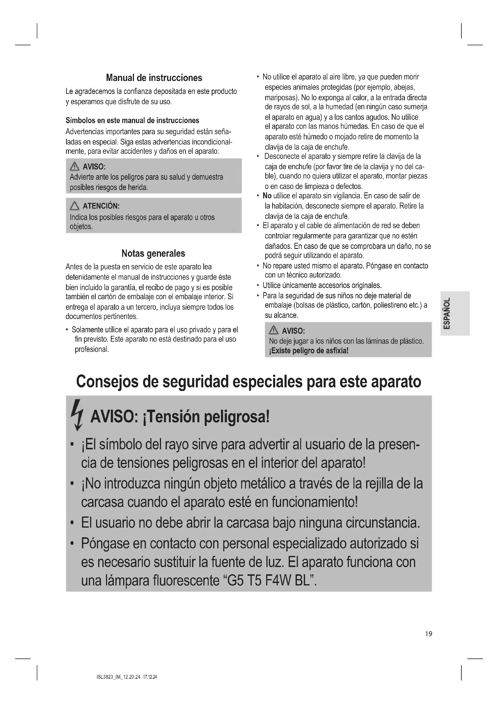 - La fuente de luz incluida sólo está prevista para esta lámpara de protección contra insectos y no para otras aplicaciones. El derecho de realizar modificaciones técnicas y de diseño en el curso del desarrollo continuo del producto esta reservado. Este aparato ha sido probado de acuerdo con todas las directivas CE vigentes y construido de acuerdo con las últimas normas de seguridad. Eliminación Fuente de luz AVISO: ¡Tensión peligrosa! El aparato debe desconectarse de la red eléctrica antes de retirar el tubo fluorescente. El tubo fluorescente debe desecharse por separado. Para ello, póngase en contacto con especialistas cualificados. Debido a su contenido en mercurio, los tubos fluorescentes T5 no deben desecharse con la basura doméstica normal. Deben llevarse a un punto de recogida de residuos peligro- sos adecuado o a un centro de reciclaje. Significado del símbolo “Cubo de basura” Proteja nuestro medio ambiente, aparatos eléc- tricos no forman parte de la basura doméstica. Haga uso de los centros de recogida previstos para la eliminación de aparatos eléctricos y entregue allí sus aparatos eléctricos que no vaya a utilizar más. Ayudará en evitar las potenciales consecuencias, a causa de una errónea eliminación de desechos, para el medio ambiente y la salud humana. Con ello, contribuirá a la recuperación, al reciclado y a otras formas de reutilización de los aparatos viejos eléctricos y electrónicos. La información cómo se debe eliminar los aparatos, se obtiene en su ayuntamiento o su administración municipal. Su distribuidor y socio contractual también está obligado a recuperar el aparato antiguo sin coste alguno.ISL3823_IM_12.20.24 17.12.24