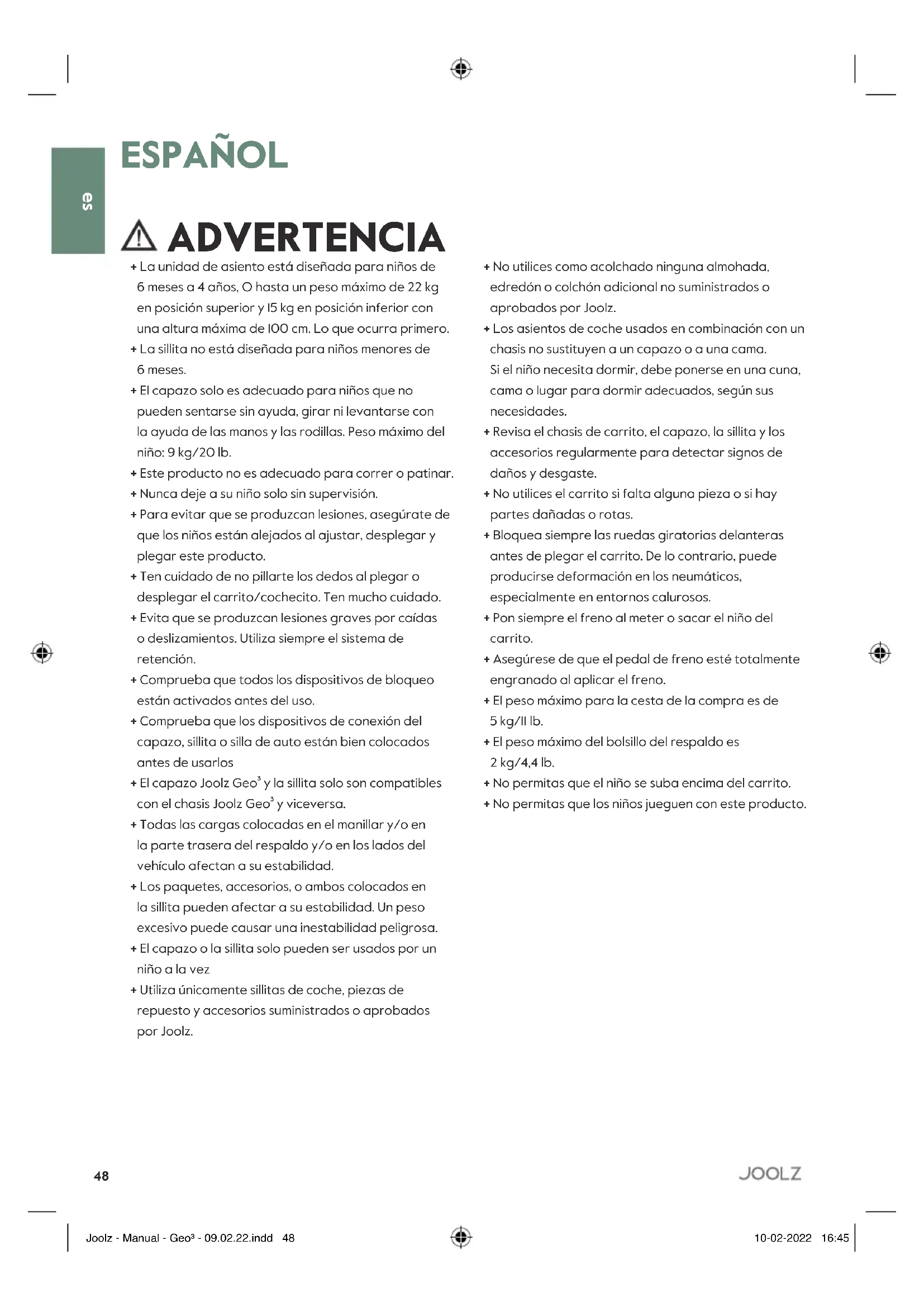 ESPAÑOL ADVERTENCIA + La unidad de asiento está diseñada para niños de 6 meses a 4 años, O hasta un peso máximo de 22 kg en posición superior y 15 kg en posición inferior con una altura máxima de 100 cm. Lo que ocurra primero. + La sillita no está diseñada para niños menores de 6 meses. + El capazo solo es adecuado para niños que no pueden sentarse sin ayuda, girar ni levantarse con la ayuda de las manos y las rodillas. Peso máximo del niño: 9 kg/20 lb. + Este producto no es adecuado para correr o patinar. + Nunca deje a su niño solo sin supervisión. + Para evitar que se produzcan lesiones, asegúrate de que los niños están alejados al ajustar, desplegar y plegar este producto. + Ten cuidado de no pillarte los dedos al plegar o desplegar el carrito/cochecito. Ten mucho cuidado. + Evita que se produzcan lesiones graves por caídas o deslizamientos. Utiliza siempre el sistema de retención. + Comprueba que todos los dispositivos de bloqueo están activados antes del uso. + Comprueba que los dispositivos de conexión del capazo, sillita o silla de auto están bien colocados antes de usarlos + El capazo Joolz Geo³ y la sillita solo son compatibles con el chasis Joolz Geo³ y viceversa. + Todas las cargas colocadas en el manillar y/o en la parte trasera del respaldo y/o en los lados del vehículo afectan a su estabilidad. + Los paquetes, accesorios, o ambos colocados en la sillita pueden afectar a su estabilidad. Un peso excesivo puede causar una inestabilidad peligrosa. + El capazo o la sillita solo pueden ser usados por un niño a la vez + Utiliza únicamente sillitas de coche, piezas de repuesto y accesorios suministrados o aprobados por Joolz. + No utilices como acolchado ninguna almohada, edredón o colchón adicional no suministrados o aprobados por Joolz. + Los asientos de coche usados en combinación con un chasis no sustituyen a un capazo o a una cama. Si el niño necesita dormir, debe ponerse en una cuna, cama o lugar para dormir adecuados, según sus necesidades. + Revisa el chasis de carrito, el capazo, la sillita y los accesorios regularmente para detectar signos de daños y desgaste. + No utilices el carrito si falta alguna pieza o si hay partes dañadas o rotas. + Bloquea siempre las ruedas giratorias delanteras antes de plegar el carrito. De lo contrario, puede producirse deformación en los neumáticos, especialmente en entornos calurosos. + Pon siempre el freno al meter o sacar el niño del carrito. + Asegúrese de que el pedal de freno esté totalmente engranado al aplicar el freno. + El peso máximo para la cesta de la compra es de 5 kg/11 lb. + El peso máximo del bolsillo del respaldo es 2 kg/4,4 lb. + No permitas que el niño se suba encima del carrito. + No permitas que los niños jueguen con este producto. Joolz - Manual - Geo³ - 09.02.22.indd 48Joolz - Manual - Geo³ - 09.02.22.indd 48 10-02-2022 16:4510-02-2022 16:4549 instruction manual Joolz Geo