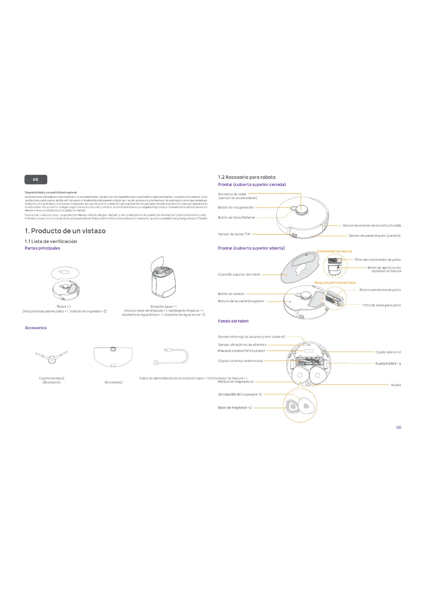 Frontal (cubierta superior cerrada) Frontal (cubierta superior abierta) Cepillo lateral x2 Rueda motriz × 2 Rueda Sensor infrarrojo de alcance y anti-caída x3 Sensor ultrasónico de alfombra Cepillo ciclónico antienredos Módulo de trapeado x2 Almohadilla del trapeador ×2 Base del trapeador ×2 Placa de nombre(N/S incluido) Fondo del robot