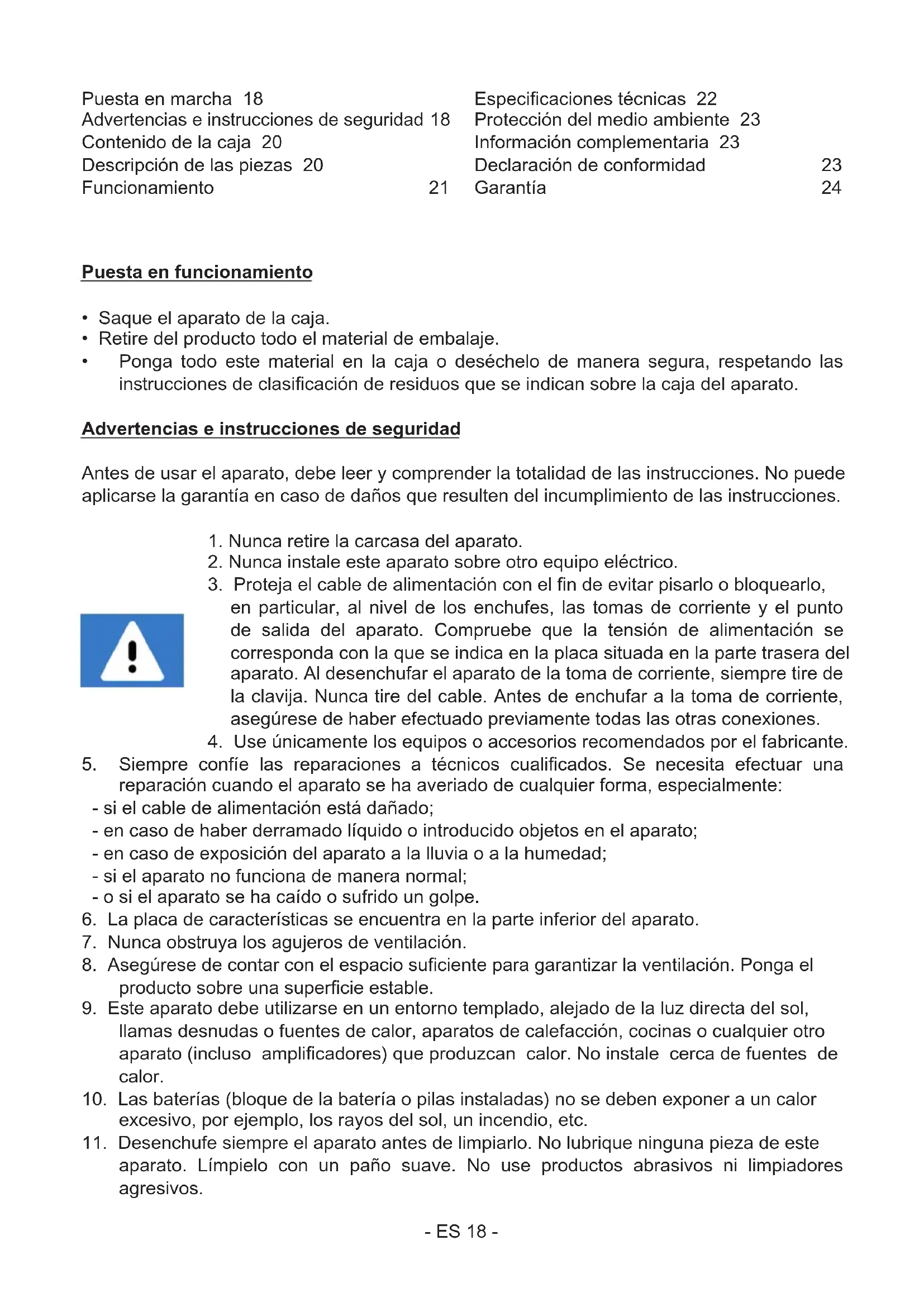 Contenido de la caja 20 Descripción de las piezas 20 Funcionamiento 21 Especicaciones técnicas 22 Protección del medio ambiente 23 Información complementaria 23 Declaración de conformidad 23 Garantía 24- ES 19 -